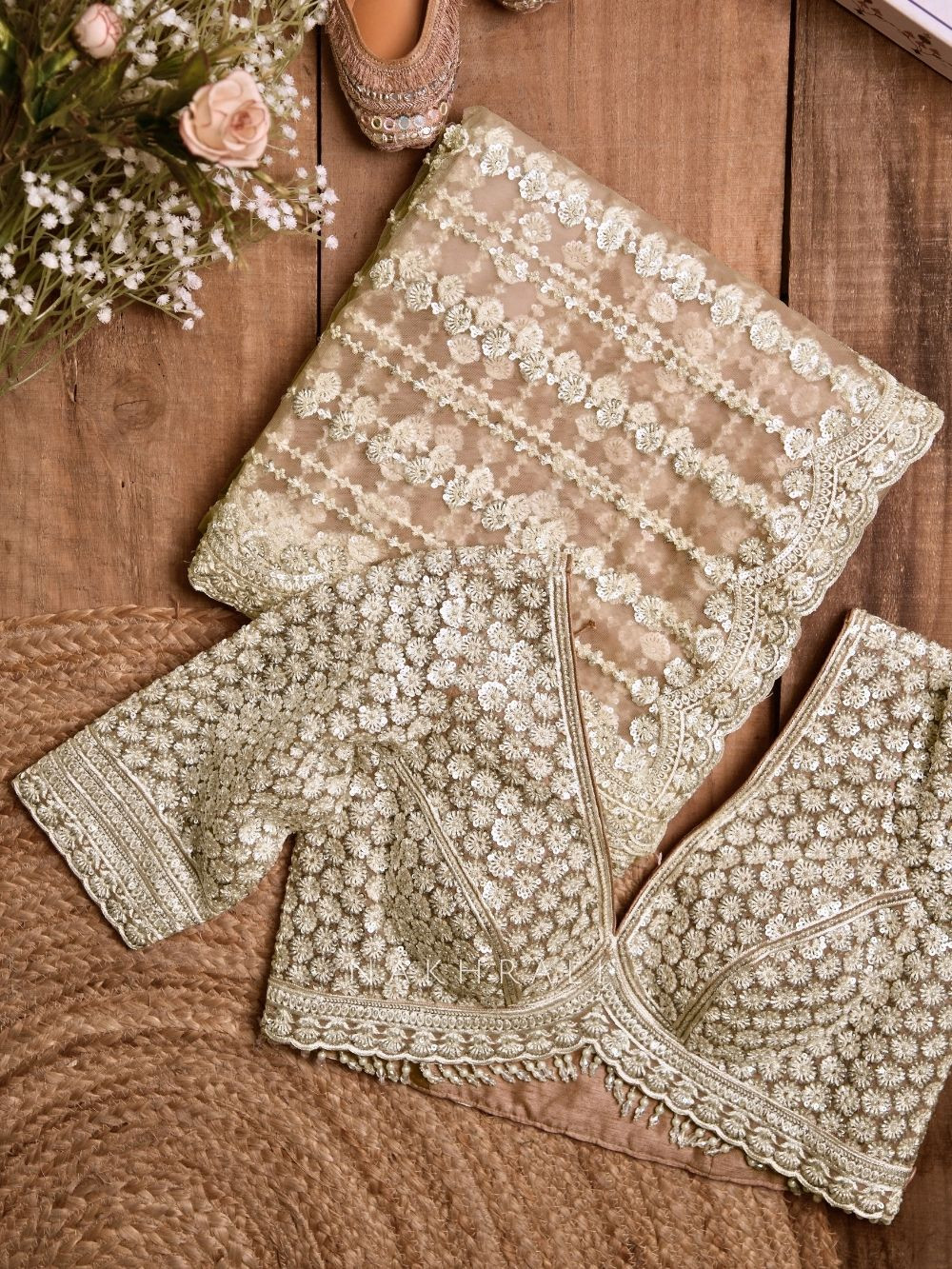 Dandelions Beige Net Saree with Pearl, Sequin & Bead Work