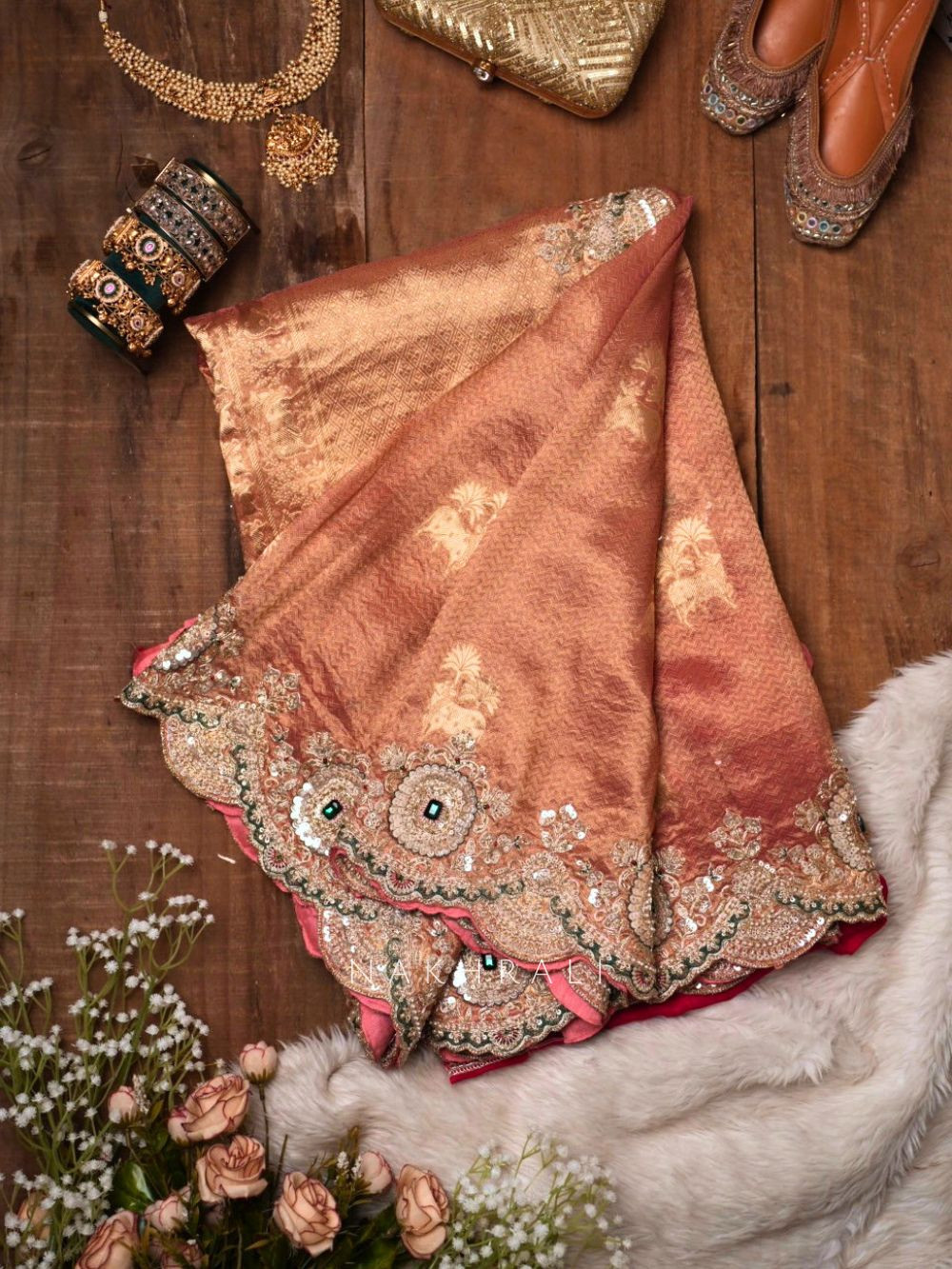 Devyani Peach Tissue Silk Saree with Zari and Zardozi Work