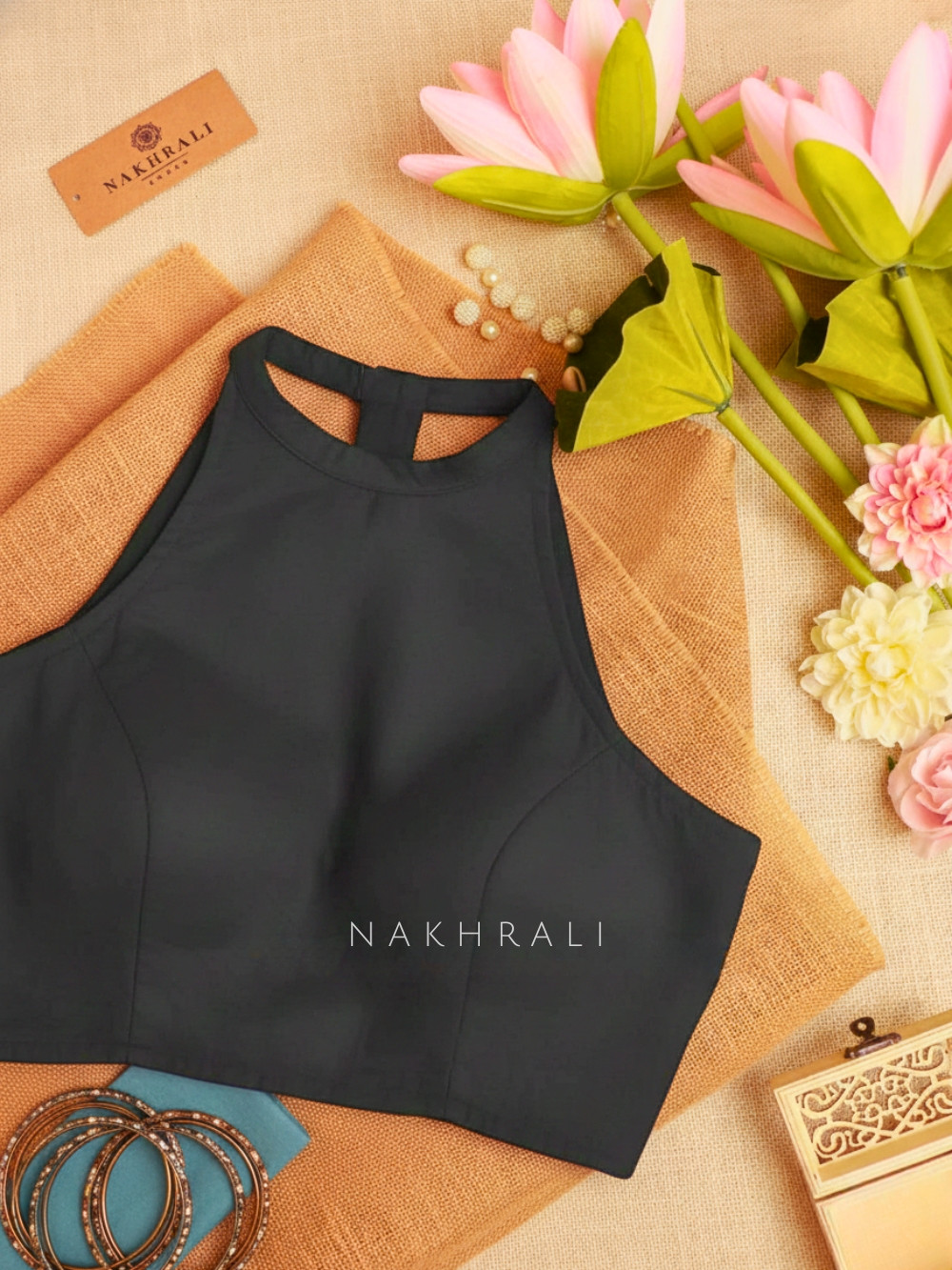 The Diva Black Cotton Solid Blouse is a timeless essential designed with a bold high-neck silhouette and a clean, sculpted structure. Crafted from breathable cotton, it offers a smooth finish that enhances the bust shape while ensuring all-day comfort. The modern T-strap back detail adds a sharp, contemporary edge, making it ideal for evening events, festive wear, and versatile everyday pairing. This rich black piece elevates any printed, metallic, silk, or pastel saree effortlessly.