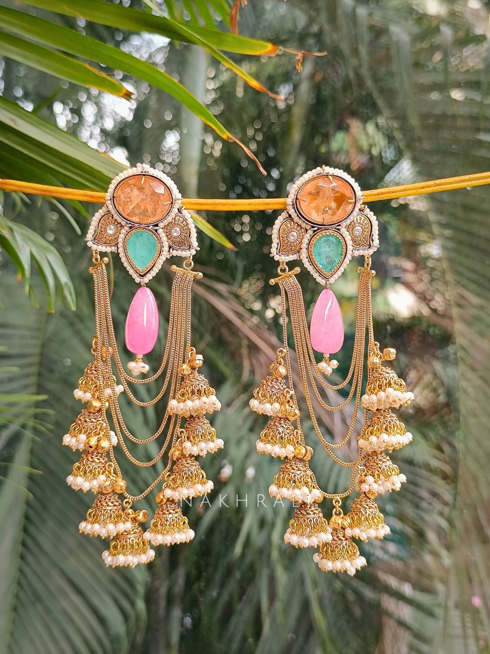 The Divya Multi-Stone Dangler Earrings with Pearl Jhumkis are a breathtaking blend of vibrant stones and traditional design. These earrings showcase a unique arrangement of pink and peach hues paired with aqua-green highlights, complemented by intricate pearl-studded jhumkis hanging in layers of golden chains. Their bold yet graceful structure makes them the ideal statement piece for weddings, festive occasions, or any celebration where you want to shine with a regal aura. A luxurious mix of contemporary flair and timeless tradition, these danglers instantly elevate your ethnic or fusion look.