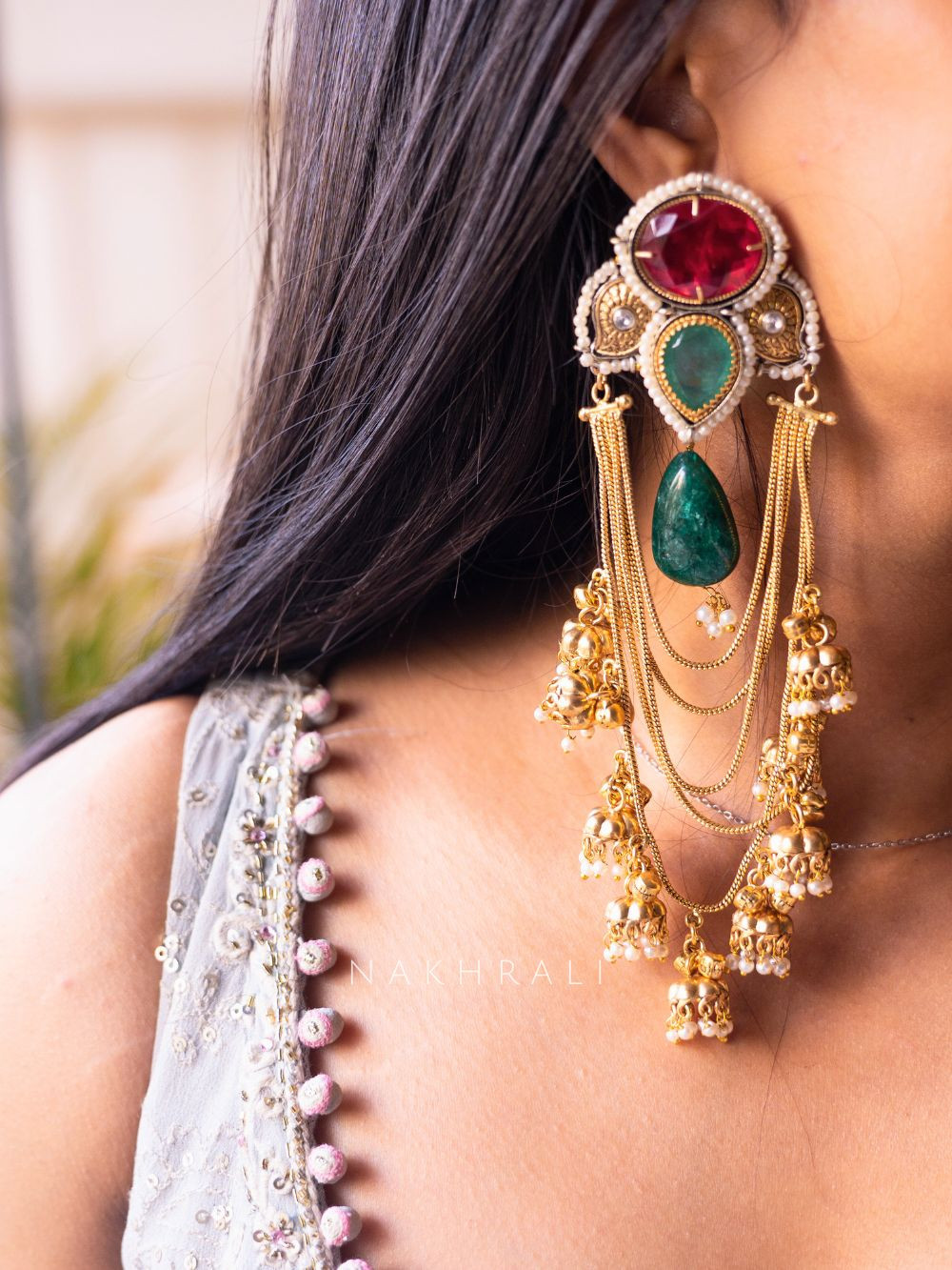 The Divya Multi-Stone Dangler Earrings with Pearl Jhumkis are a breathtaking blend of vibrant stones and traditional design. These earrings showcase a unique arrangement of pink and peach hues paired with aqua-green highlights, complemented by intricate pearl-studded jhumkis hanging in layers of golden chains. Their bold yet graceful structure makes them the ideal statement piece for weddings, festive occasions, or any celebration where you want to shine with a regal aura. A luxurious mix of contemporary flair and timeless tradition, these danglers instantly elevate your ethnic or fusion look.
