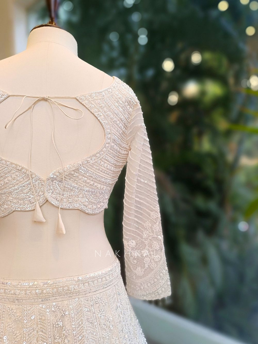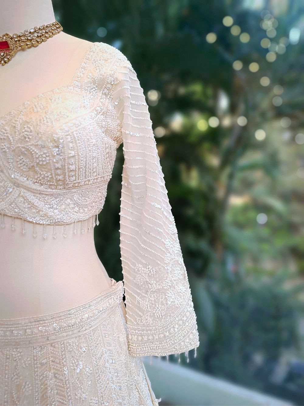 This white lehenga showcases exquisite craftsmanship with dense sequin and cut dana detailing flowing across the skirt in symmetrical patterns. The blouse features refined handwork, highlighted with delicate bead tassels. The dupatta carries minimal embroidery for a soft, graceful finish. Designed for brides and reception looks, this lehenga delivers a radiant, modern aesthetic while keeping every detail refined and sophisticated.