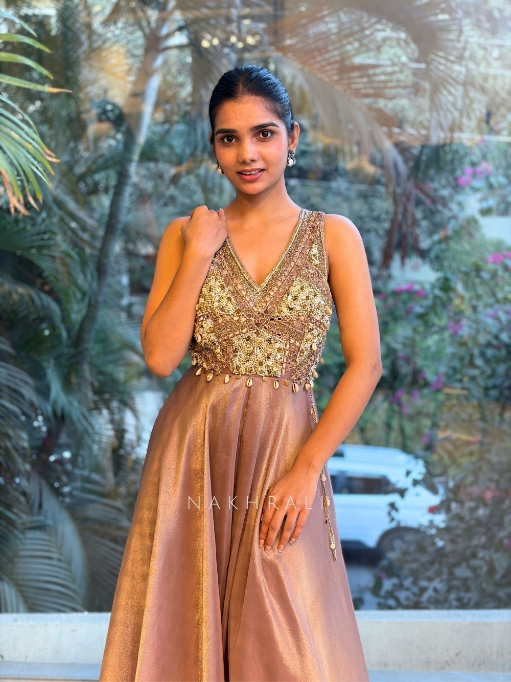 The Liora Jumpsuit is crafted in a rich brownish pink tone with a beautifully embellished bodice that highlights fine embroidery and sequin detailing. The sleeveless V-neck design enhances the neckline while the fitted upper structure flows seamlessly into a soft, wide flared bottom that adds movement and drama. The back features a neat closure for a clean finish, making this jumpsuit a refined alternative to traditional festive outfits. Ideal for cocktail nights, festive gatherings, and special celebrations where modern elegance is key.