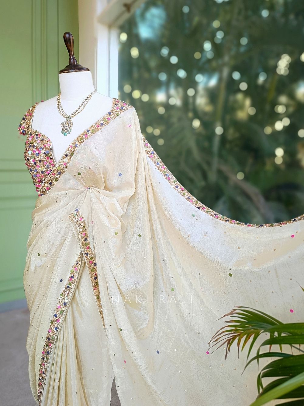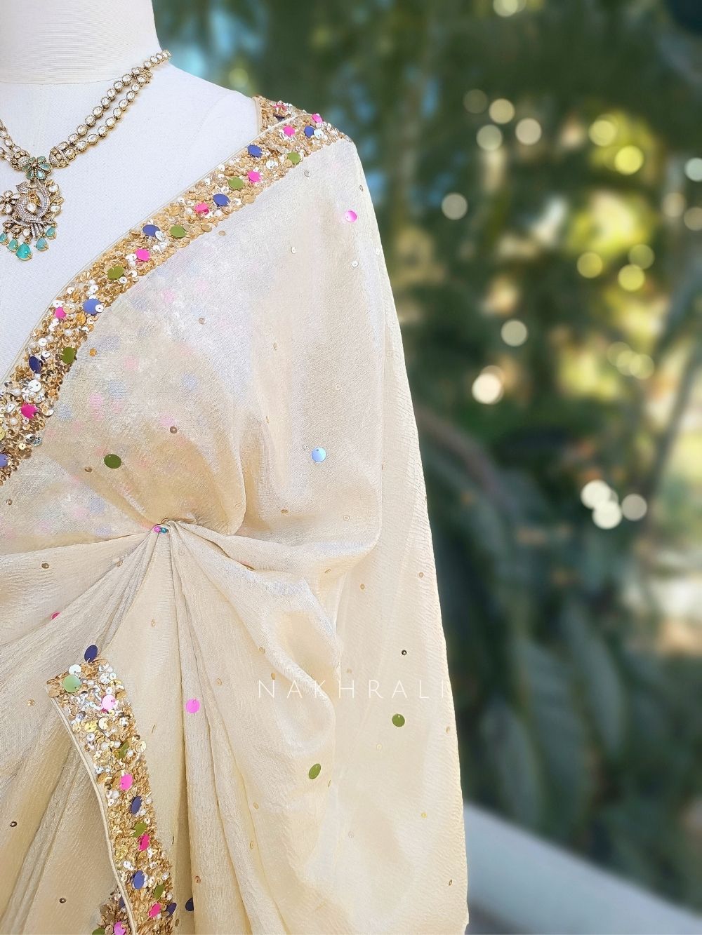 Dry clean only; avoid machine washing. Store in muslin cloth to protect embellishments. Keep away from direct sunlight and humidity. Iron on reverse using low heat. Avoid perfume contact with the embroidery.