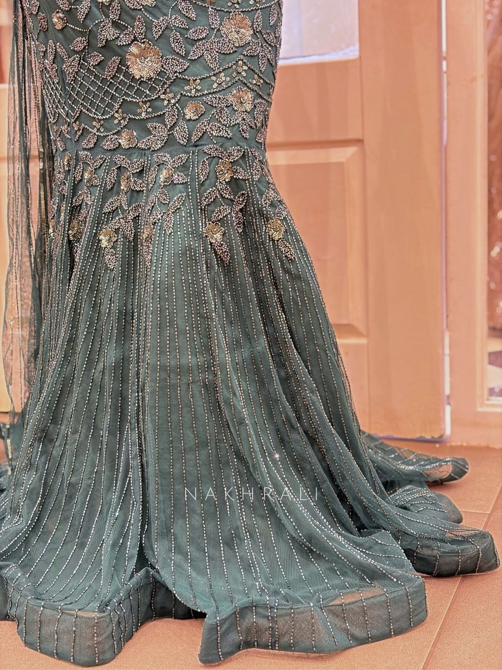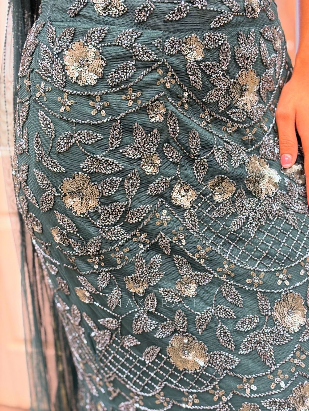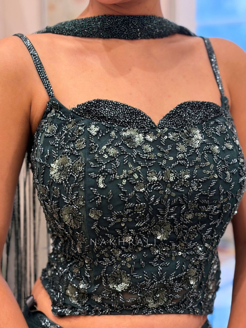 This Indo-Western lehenga set is designed for modern festive dressing with a bold, structured silhouette. The set includes a fitted bustier-style blouse with intricate sequin and cut dana embroidery, paired with a high-waist mermaid lehenga that flares gracefully at the hem. The sheer net dupatta adds movement and softness, balancing the sharp tailoring of the blouse and skirt. The all-over embroidery creates depth and shimmer without overpowering the look, making it ideal for cocktail nights, sangeet functions, receptions, and fashion-forward wedding events. Available in five rich colours—brown, green, wine, blue, and red—each shade enhances the embroidery and overall impact of the outfit.