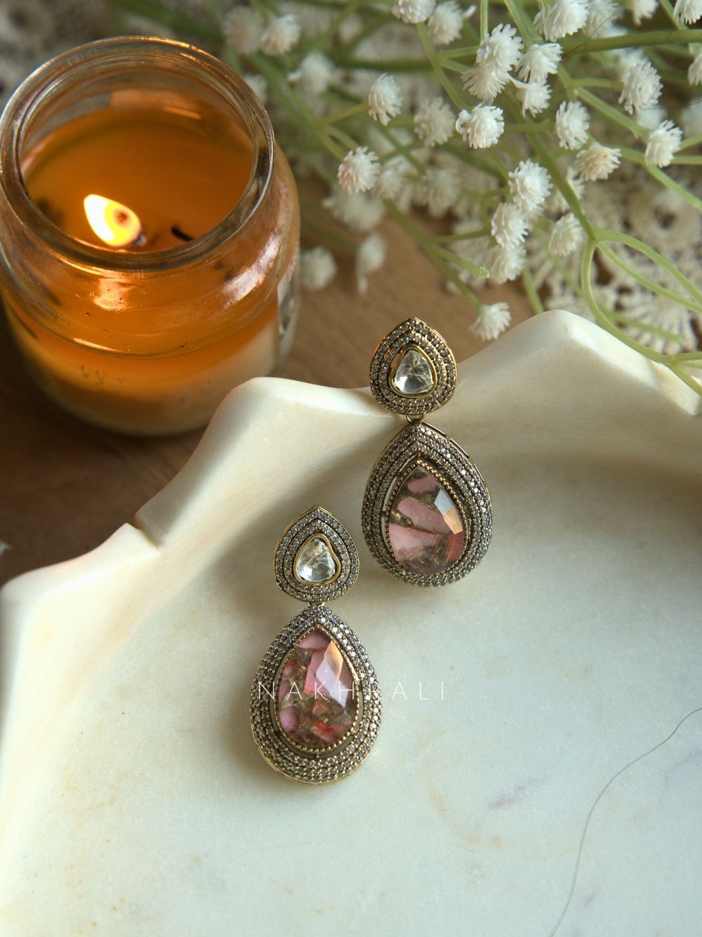 These teardrop earrings are designed with a beautifully faceted statement stone at the center, each piece showcasing natural variations that make it feel one of a kind. The stone is surrounded by delicately placed white crystals that add brilliance and definition without overpowering the design. The layered teardrop silhouette creates a graceful drop effect, making the earrings eye-catching yet refined. Perfect for festive occasions, weddings, and evening gatherings, they balance traditional charm with a modern, polished finish.
