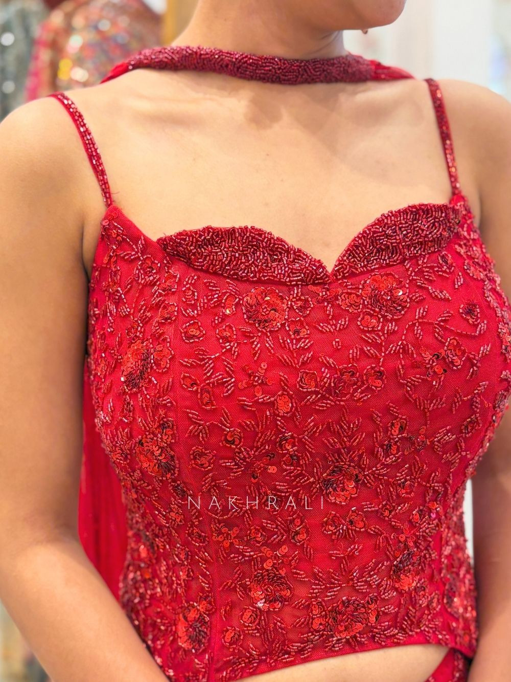 This Indo-Western lehenga set is designed for modern festive dressing with a bold, structured silhouette. The set includes a fitted bustier-style blouse with intricate sequin and cut dana embroidery, paired with a high-waist mermaid lehenga that flares gracefully at the hem. The sheer net dupatta adds movement and softness, balancing the sharp tailoring of the blouse and skirt. The all-over embroidery creates depth and shimmer without overpowering the look, making it ideal for cocktail nights, sangeet functions, receptions, and fashion-forward wedding events. Available in five rich colours—brown, green, wine, blue, and red—each shade enhances the embroidery and overall impact of the outfit.