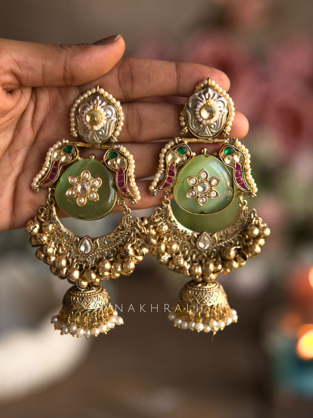 These earrings are crafted as bold temple-inspired jhumkas with a striking sage green stone at the center, framed by kundan detailing and intricate metalwork. The design is elevated with pearl outlines, engraved motifs, and layered ghungroo-style drops that add movement and richness. The antique gold tone gives them a heritage feel, while the green stone keeps the look refined and modern. Ideal for festive wear, weddings, and traditional celebrations where you want your jewellery to stand out without looking heavy or dated.