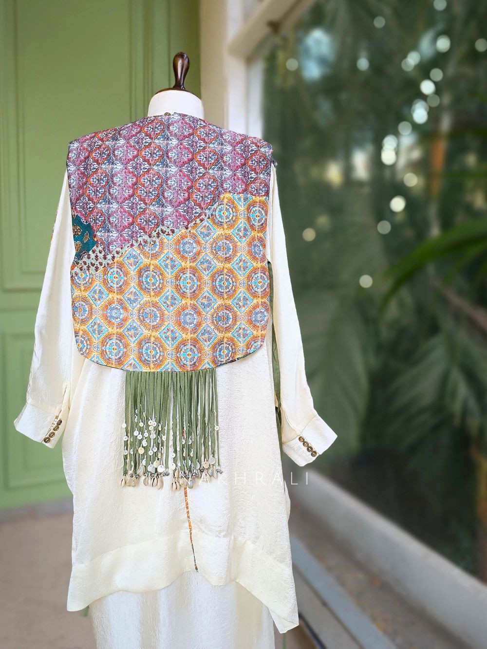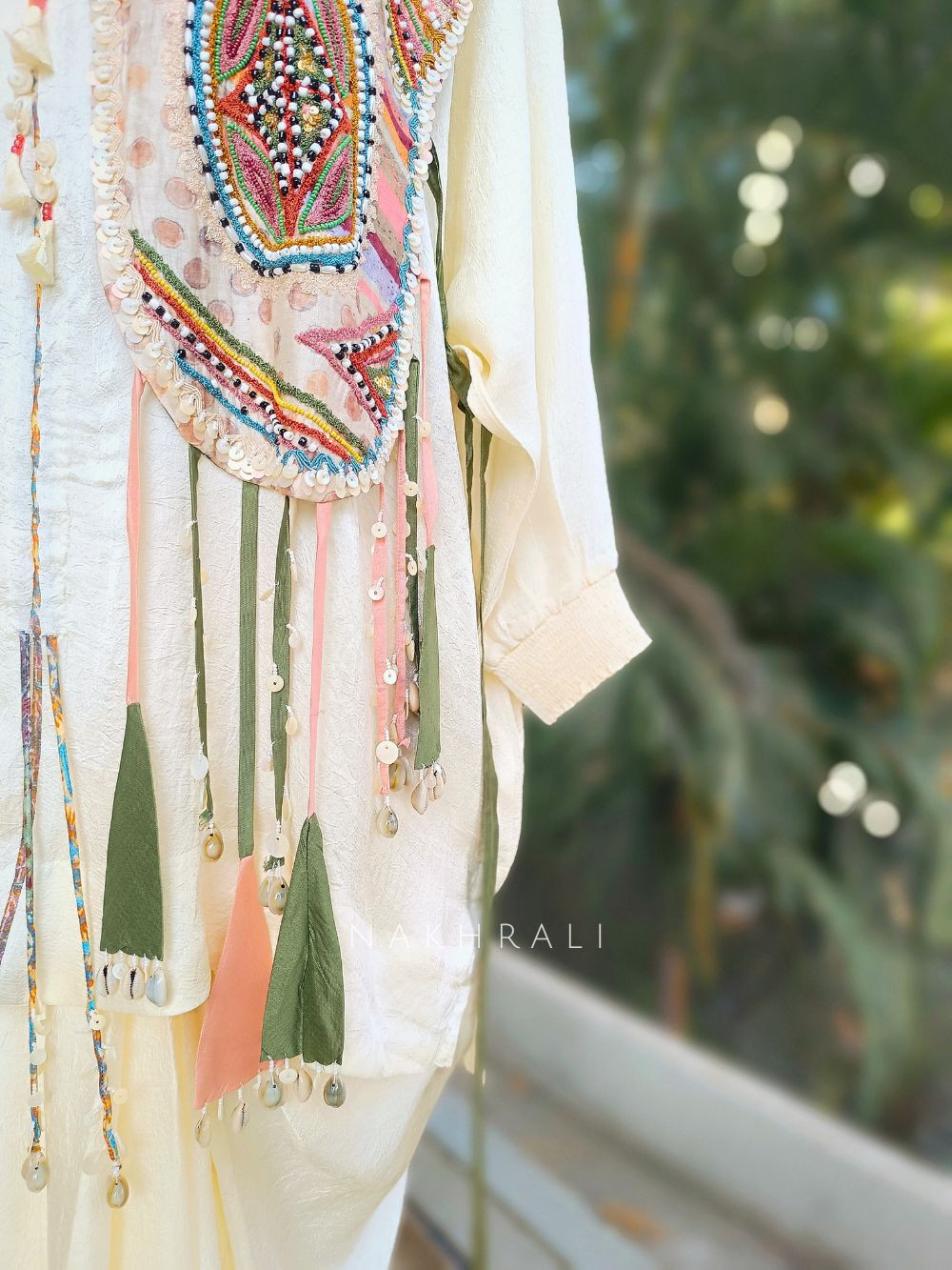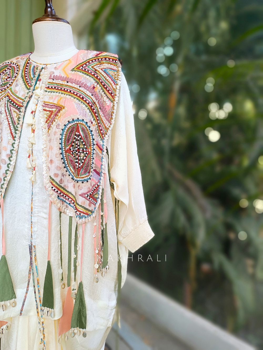 This cream indo-western set stands out with its beautifully handcrafted embroidered jacket that adds depth and character to the ensemble. The jacket showcases detailed multicolour embroidery with bead and sequin accents, finished with hanging tassel elements that bring movement and texture. Paired with a coordinated inner layer and flowy bottom, the silhouette feels effortless yet statement-worthy. The overall look blends contemporary structure with artisanal detailing, making it ideal for those who prefer modern ethnic styling with a handcrafted touch.