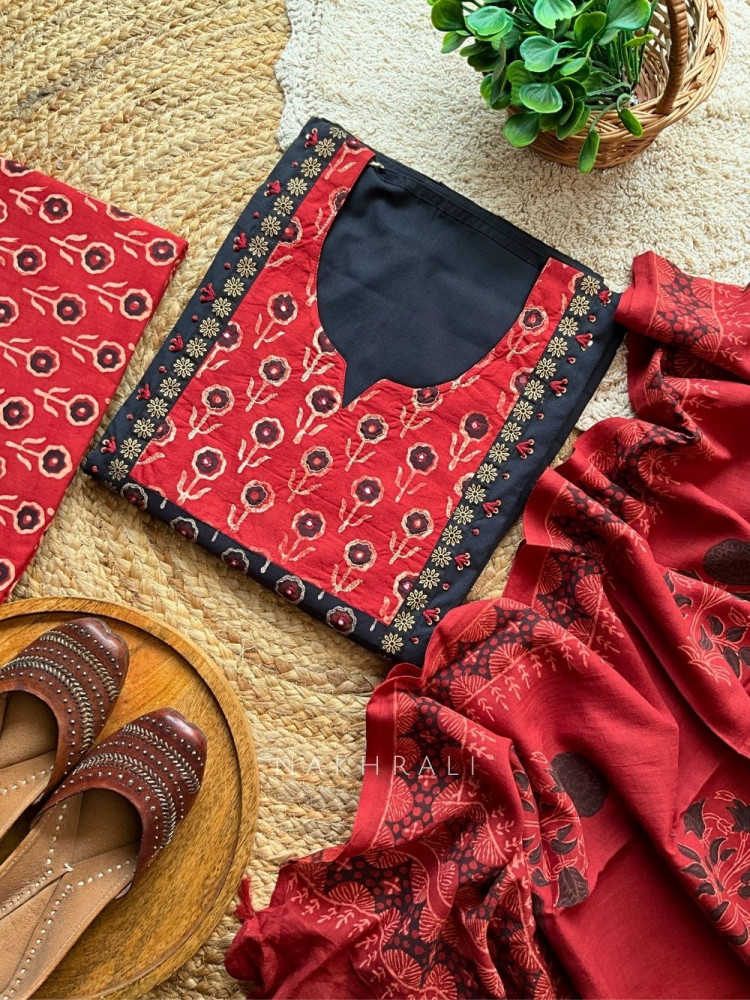 Elegant Printed Red Cotton Dress Material with Sequin Embellished Neckline