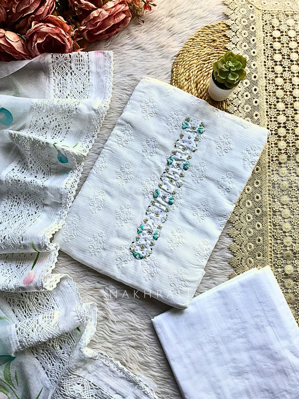 This cotton dress material set is designed for comfort with a touch of refined detailing. The kurta fabric features subtle woven textures enhanced with intricate hand embellishment along the neckline, adding a graceful focal point without overwhelming the look. Paired with a lightweight dupatta and coordinating bottom fabric, this set is ideal for daily wear, office hours, casual gatherings, and relaxed festive moments. Available in soft pink, lavender, and blue tones, it offers an effortless blend of simplicity and elegance.