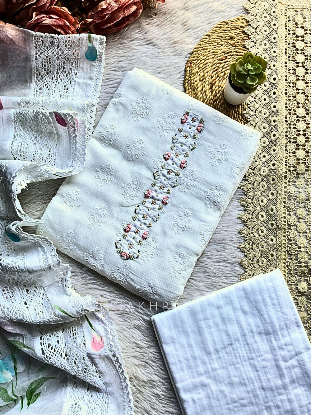 This cotton dress material set is designed for comfort with a touch of refined detailing. The kurta fabric features subtle woven textures enhanced with intricate hand embellishment along the neckline, adding a graceful focal point without overwhelming the look. Paired with a lightweight dupatta and coordinating bottom fabric, this set is ideal for daily wear, office hours, casual gatherings, and relaxed festive moments. Available in soft pink, lavender, and blue tones, it offers an effortless blend of simplicity and elegance.