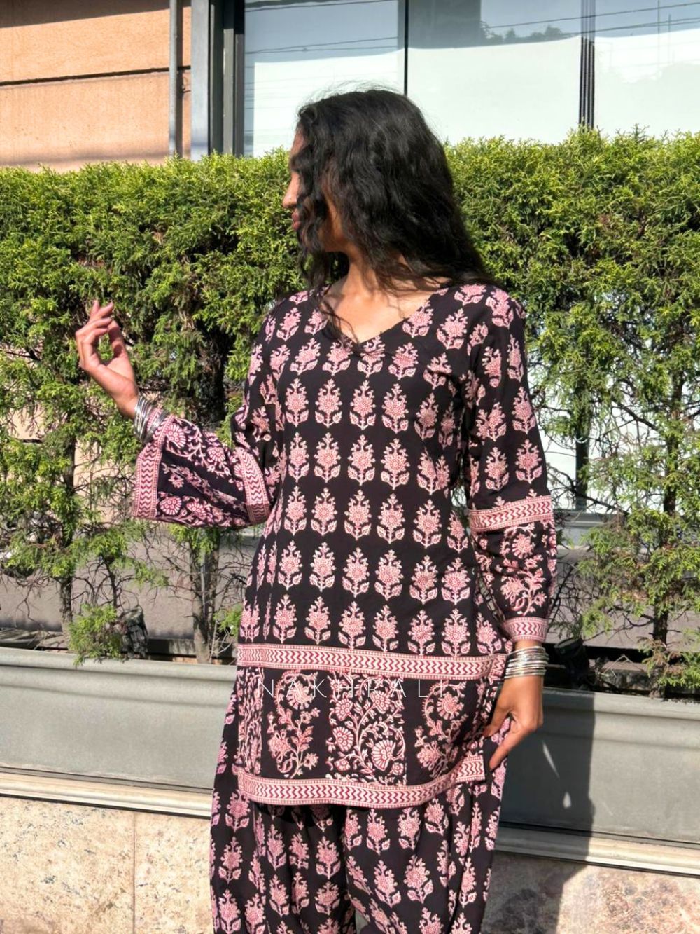 Elvar Black Cotton Block Print Kurti with Farsi Salwar Set