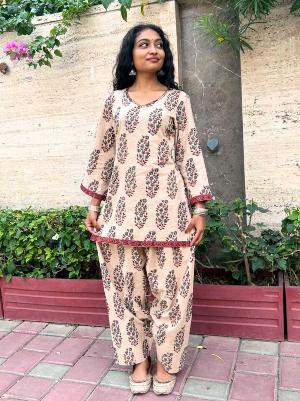 Elvarya Beige Cotton Block Print Kurti with Farsi Salwar Set