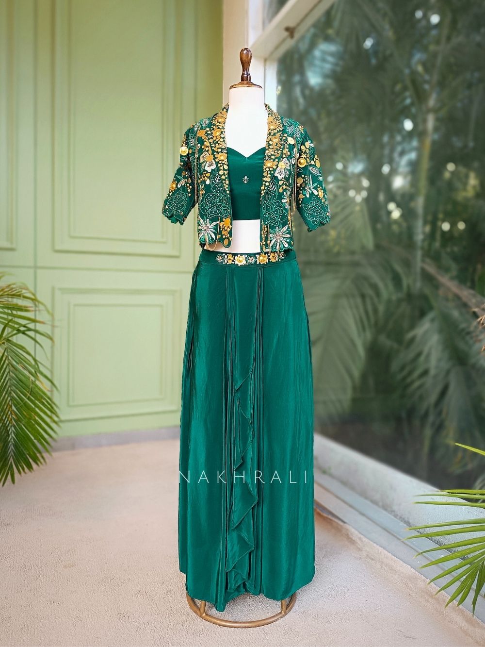 Elysia Green Sequin & Mirror Work Indo-Western Set with Embellished Jacket