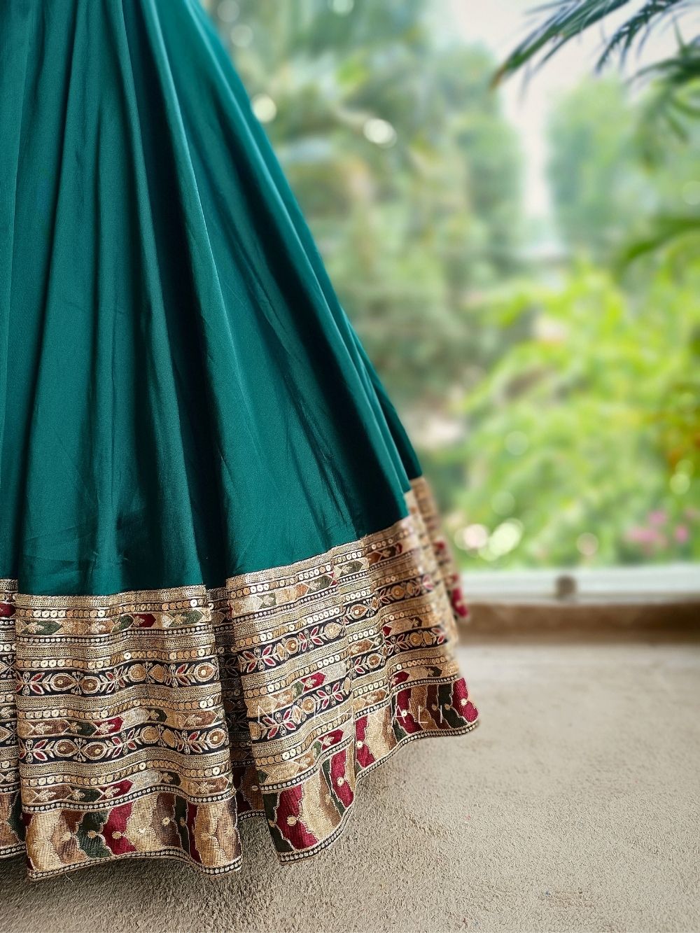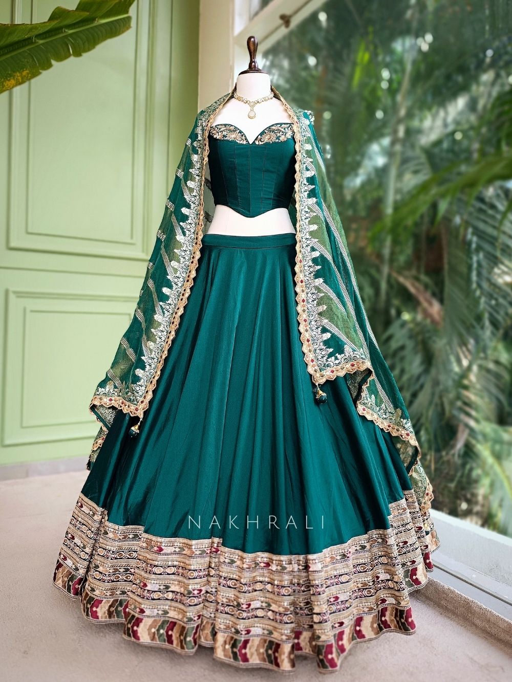 Step into timeless elegance with the Emerald Enchant Corset Lehenga. Designed in a rich emerald green hue, this lehenga features a voluminous skirt adorned with intricate border work that exudes regal charm. The beautifully structured corset blouse, highlighted with delicate floral embroidery on the neckline, adds a modern twist to the traditional silhouette. Paired with a sheer dupatta enhanced with zari and embroidered details, this ensemble is perfect for weddings, festive occasions, and evening celebrations.