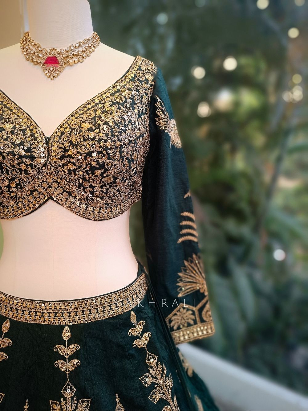 Pair with kundan choker and soft waves for an imperial bridal charm.