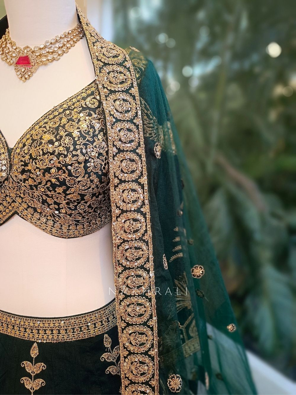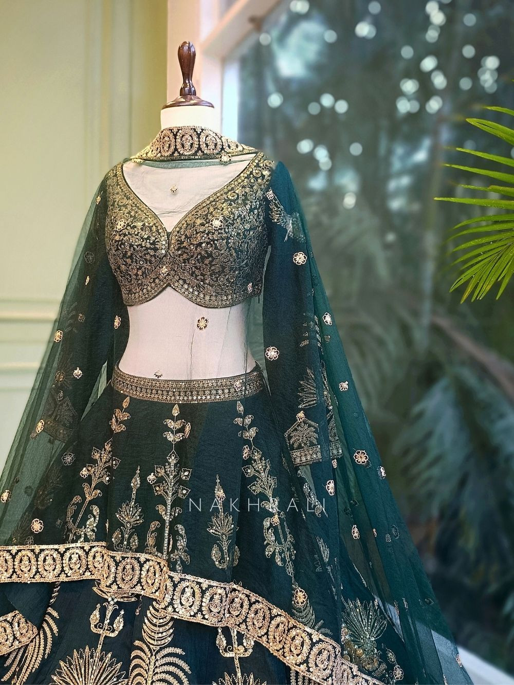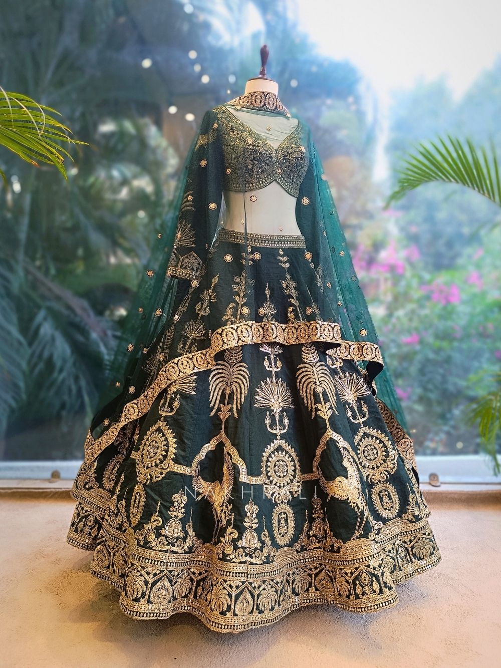 This deep green silk lehenga stands out with its exquisite zari thread and sequin embroidery, creating a luxurious and regal look for weddings and grand festivities. The lehenga features structured floral and peacock-inspired motifs, while the blouse showcases heavy golden detailing for a statement finish. The sheer dupatta is bordered with ornate embroidered panels, completing the elegant silhouette designed for brides or wedding attendees wanting a timeless, royal presence.
