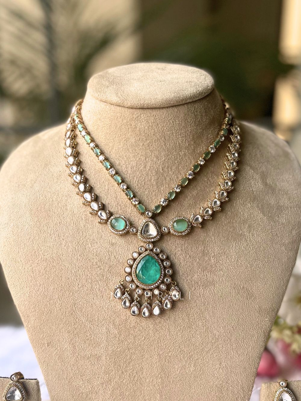 This necklace set showcases a refined blend of classic kundan craftsmanship and graceful layering. Designed with two delicate strands leading to a striking drop pendant, it creates a balanced yet luxurious look. The matching earrings mirror the pendant design, completing the set beautifully. The finish and stone placement make it suitable for weddings, festive occasions, and evening celebrations, offering versatility without overpowering the outfit. Available in Sea Green and Emerald Green, each color brings its own distinct charm while maintaining the same timeless silhouette.