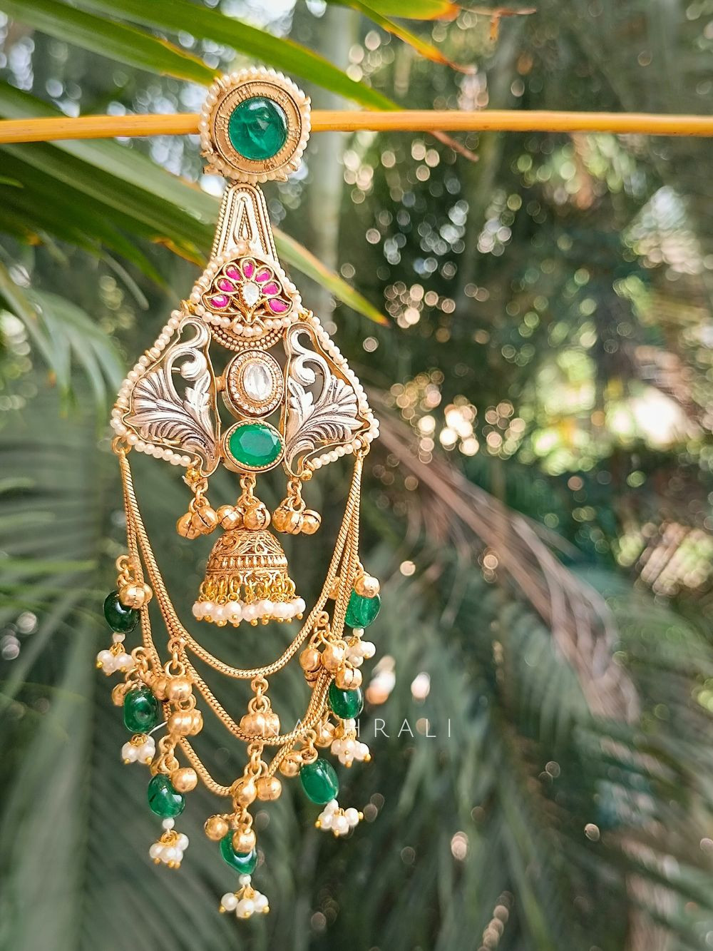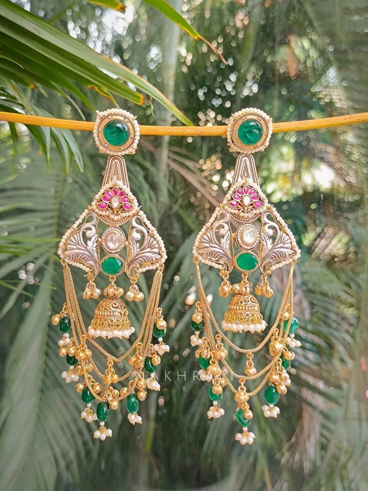 The Eternal Grace Dangler Earrings are a blend of heritage and charm, designed to elevate any festive or wedding look. Featuring intricate filigree detailing, delicate jhumka drops, and layers of golden chains adorned with pearls and colored beads, these earrings bring a royal elegance. Available in green, purple, sage green, and pink stone accents, they pair beautifully with sarees, lehengas, and suit sets, making them a versatile choice for celebrations.