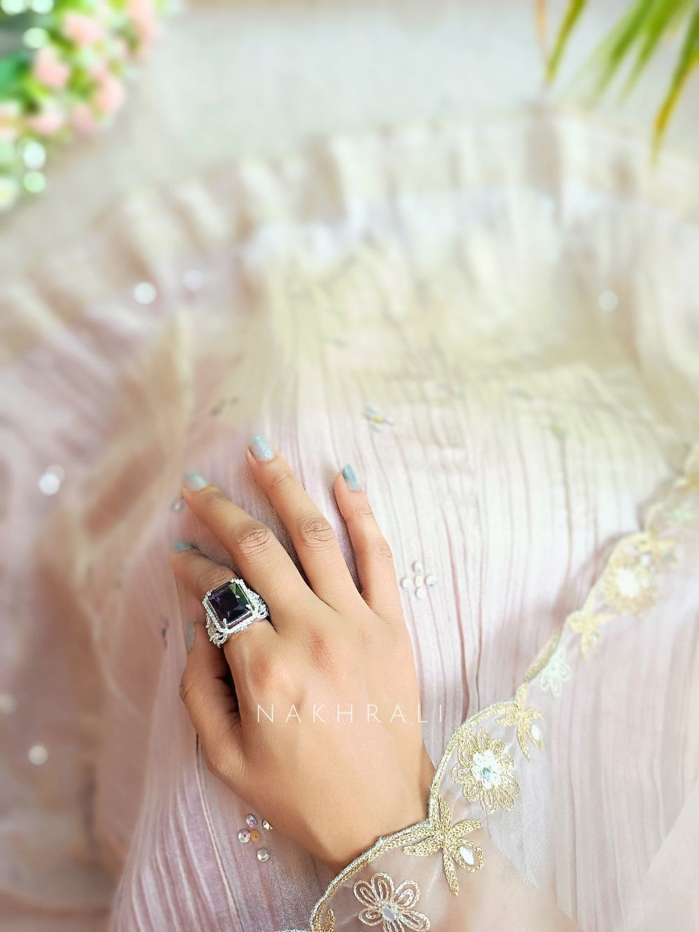 The Eternal Royale Statement Ring is a perfect fusion of grandeur and elegance. Designed with bold square-cut stones in rich shades of purple, striking red, and refreshing sea green, this ring brings a regal charm to your ensemble. The stone is bordered with shimmering crystals, adding brilliance and sophistication. Whether paired with traditional attire or contemporary styles, this ring exudes luxury and makes an unforgettable impression at weddings, festive events, and celebrations.