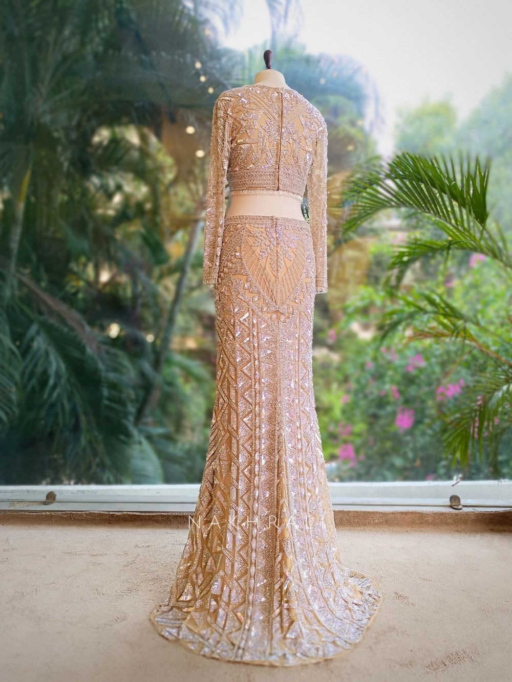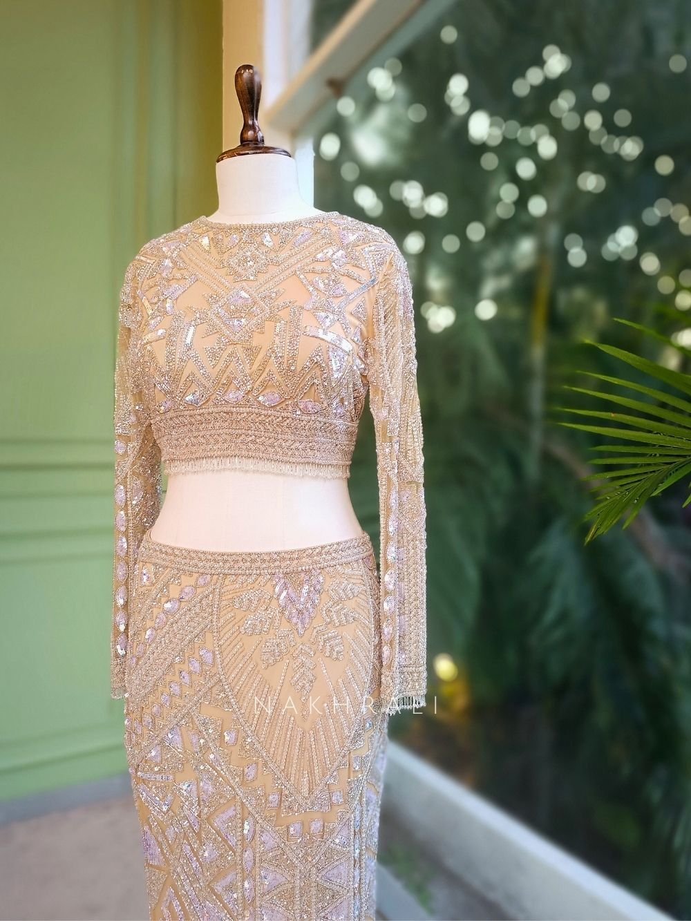 Dry clean only; avoid direct contact with water or perfume. Store flat in a muslin cover. Handle delicate embellishments with care. Avoid folding at heavily worked areas. Steam on reverse if needed; do not iron directly.