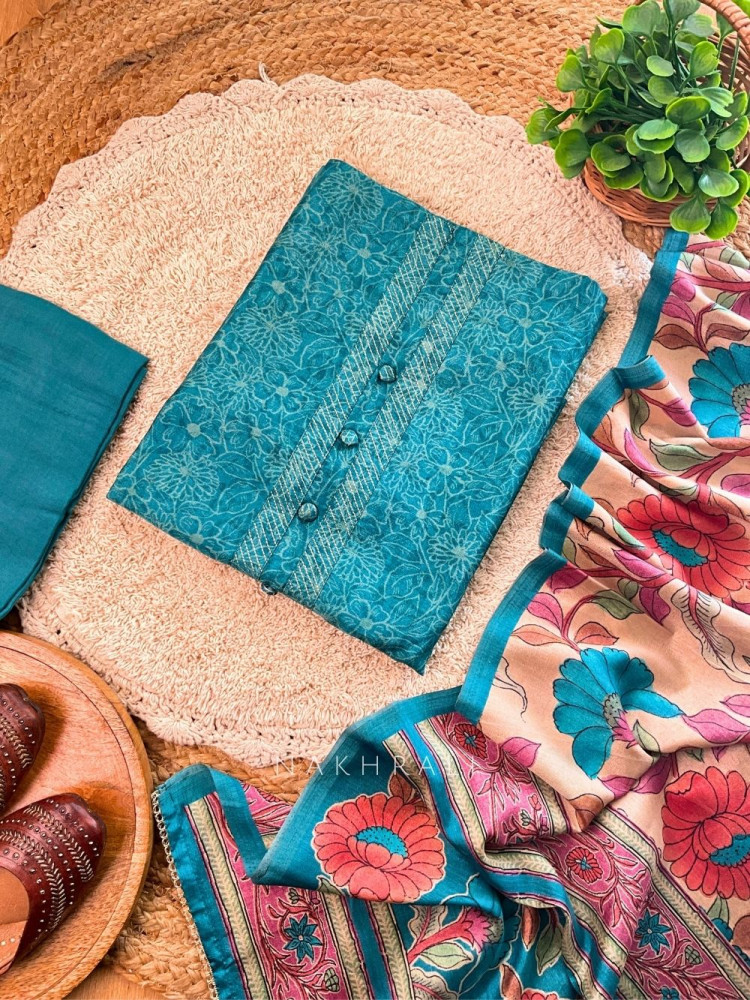 Step into everyday elegance with this stunning printed dress material set, designed for comfort and effortless style. The kurta features a graceful floral print with a buttoned neckline and fine detailing, giving it a chic yet traditional appeal. The highlight is the beautifully contrasting dupatta adorned with bold, artistic floral motifs, adding a pop of color and personality to the outfit. Perfect for casual outings, small gatherings, or festive afternoons, this set brings together sophistication and charm in a truly wearable way.