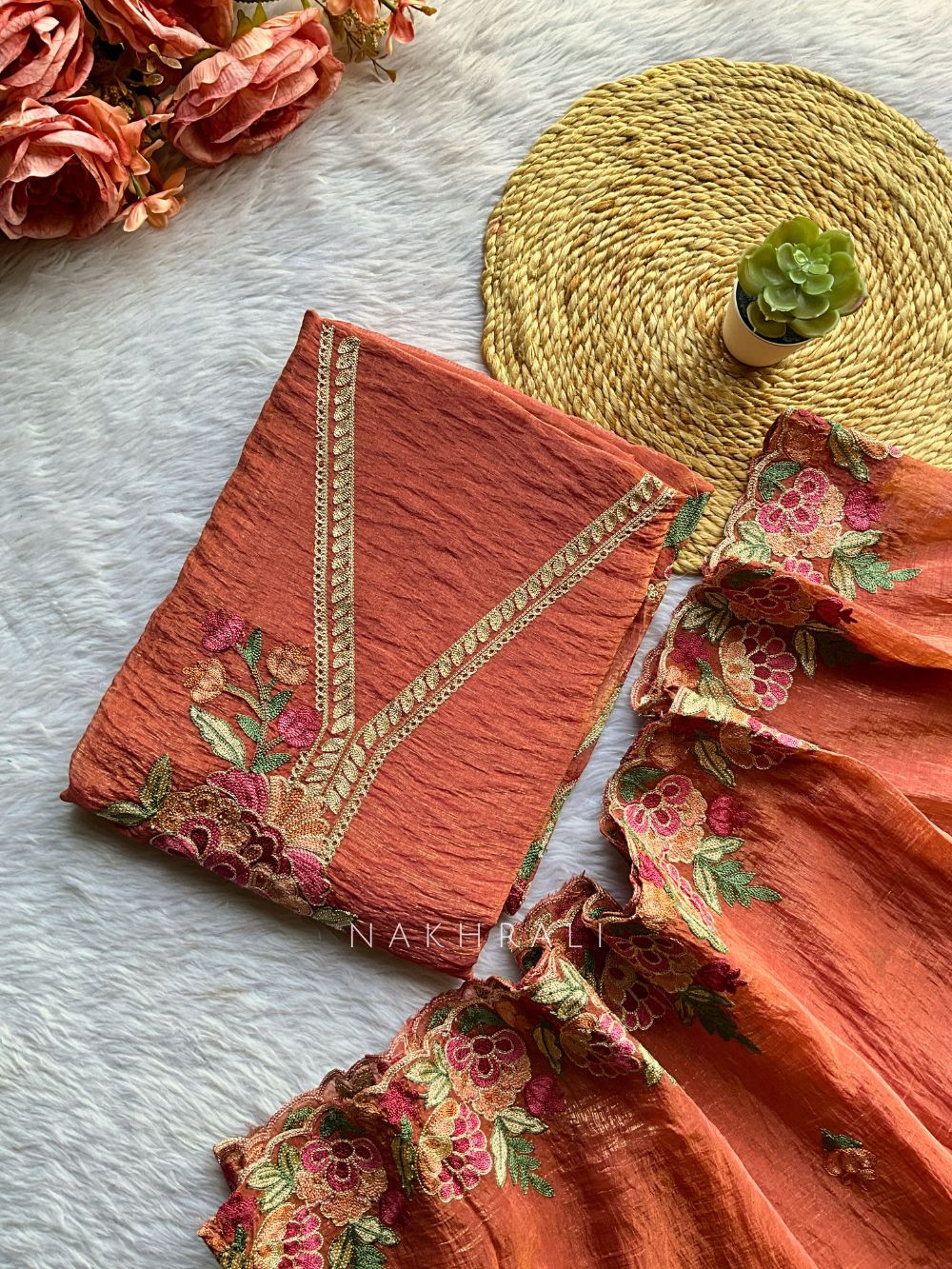 This dress material set is designed with a graceful V-pattern neckline highlighted by detailed floral embroidery in multicolour threadwork, creating a soft yet striking focal point. The base showcases subtle self-textured detailing that adds depth without overpowering the design. The matching dupatta is finished with an embroidered floral border that enhances movement and visual appeal. Balanced, elegant, and thoughtfully detailed, this set is ideal for festive gatherings, daytime celebrations, and graceful evening wear when stitched to preference.