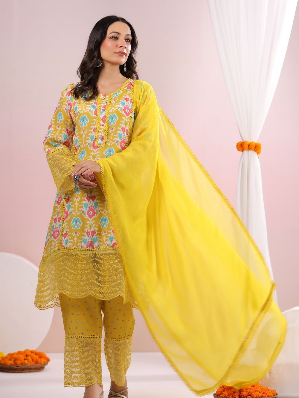 Golden Bloom Yellow Printed Cotton Suit Set with Lace Accents