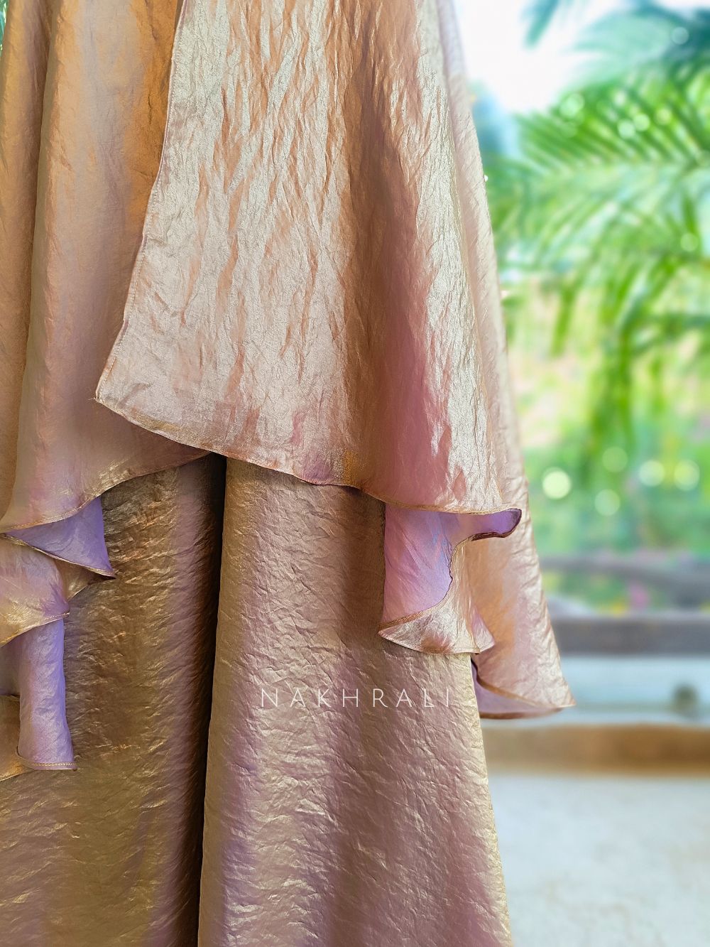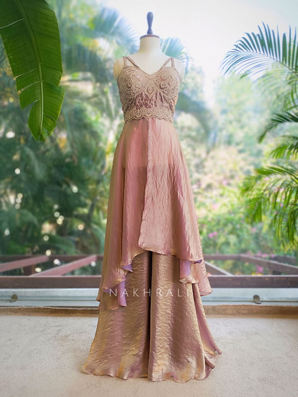 This refined indo western set is designed with a fluid layered silhouette that blends softness with structure. The top is intricately adorned with detailed thread embroidery, enhanced with mirror and stone embellishments that add subtle sparkle. Paired with wide-leg palazzo pants and a lightweight dupatta, this ensemble creates effortless movement and elegance, making it ideal for festive evenings, intimate functions and modern celebration wear.