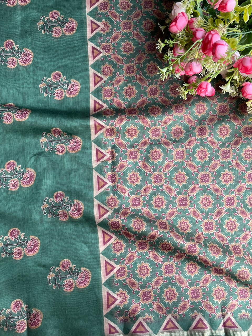 This green printed dress material set features classic ethnic motifs on the kurta fabric, complemented by a solid bottom and an embroidered border dupatta. The earthy green tone lends a fresh traditional feel, making it suitable for casual festive events, daytime functions, and relaxed ethnic dressing.