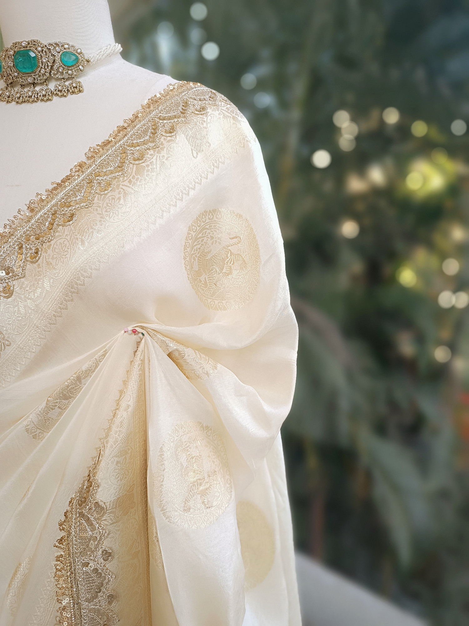 The Ivory Heritage Zari Border Woven Saree embodies understated sophistication. Designed with a fluid drape, the saree features subtle woven motifs that add texture while keeping the look refined. The zari border enhances the saree with a festive yet elegant finish, making it suitable for both traditional and contemporary styling. The pallu carries the same detailing for a balanced appearance. It comes with a matching running blouse piece attached to the saree, allowing custom tailoring as per preference. Ideal for festive events, poojas, family gatherings, and daytime functions.