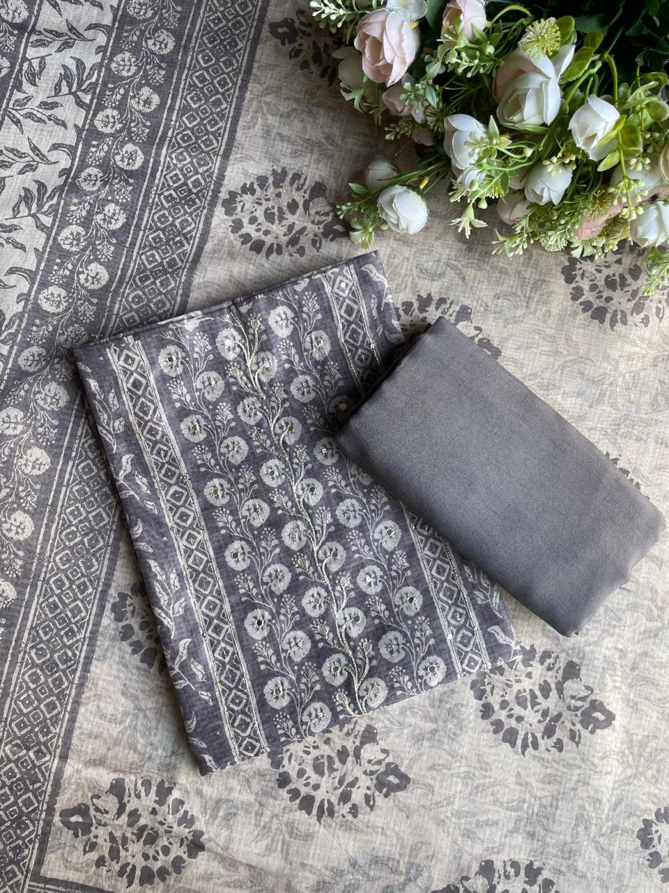 Grey Printed Dress Material with Subtle Embroidered Detailing