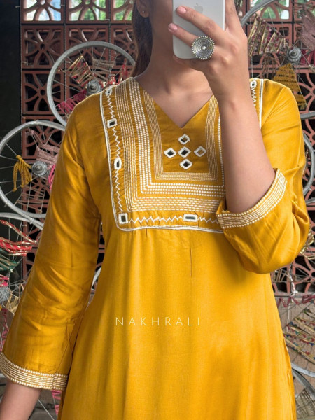 Brighten your day with this sunshine yellow pant kurta set made in pure mul cotton. Lightweight and breathable, the kurta is detailed with elegant embroidery on the neckline and cuffs, keeping the design refined yet eye-catching. The cotton pants complete the look with ease. Whether you're heading to work, attending a festive lunch, or just looking to dress up effortlessly, this set is a timeless staple for all seasons.