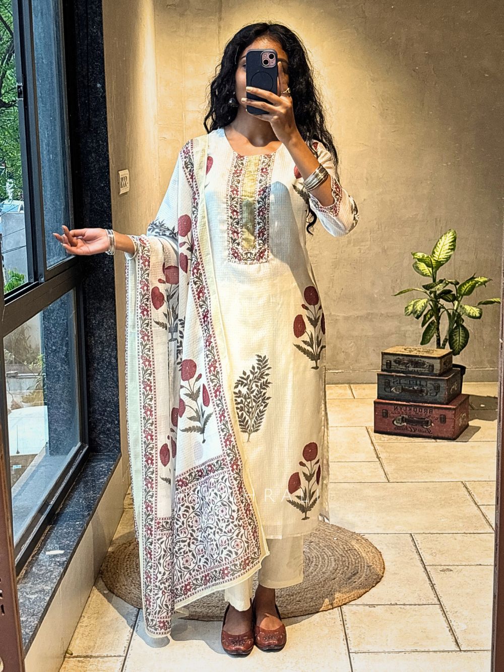 Gulposh Cream Kota Doria Floral Suit Set