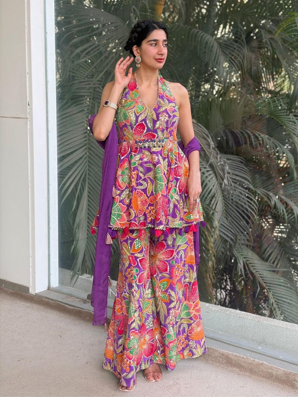 This elegant indo-western set features a beautifully crafted halter-neck peplum top paired with flowy palazzo pants and a lightweight dupatta. The set is adorned with intricate multicolour floral embroidery enhanced with fine sequin work, creating a rich festive appeal without feeling overly heavy. The peplum silhouette adds structure and definition, while the palazzo pants ensure comfort and graceful movement. The soft dupatta with tassel detailing completes the look with effortless elegance.