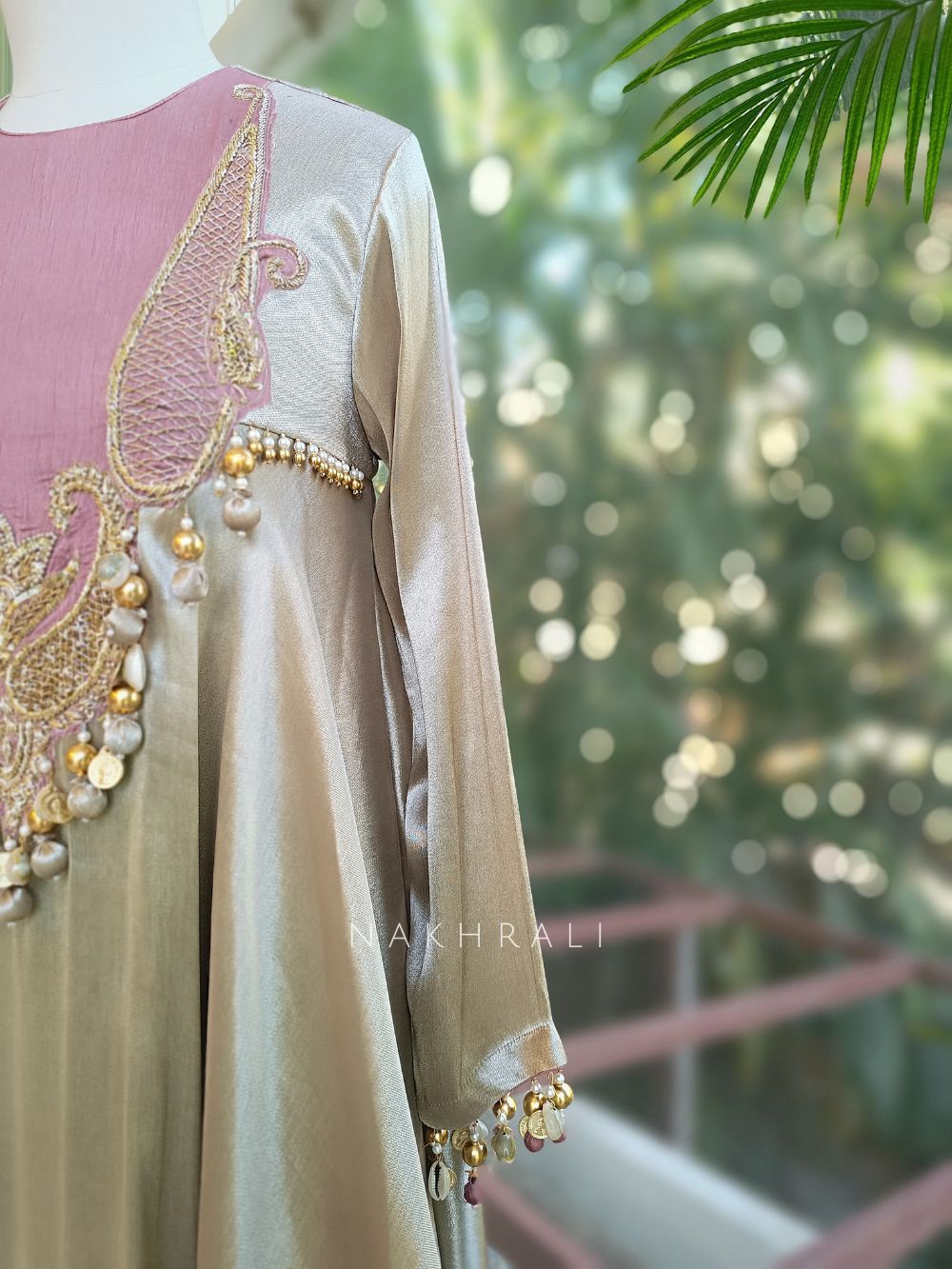 This elegant nude suit set is adorned with intricate zari and sequin embroidery that beautifully enhances the neckline and front panel. The design is elevated with detailed embellishments and delicate tassel accents that add a festive charm. The flowing silhouette is paired with coordinated bottoms and completed with a graceful dupatta finished with traditional kangura lace borders. Perfect for wedding functions, festive gatherings, and elegant celebrations, this outfit blends classic craftsmanship with refined contemporary appeal.
