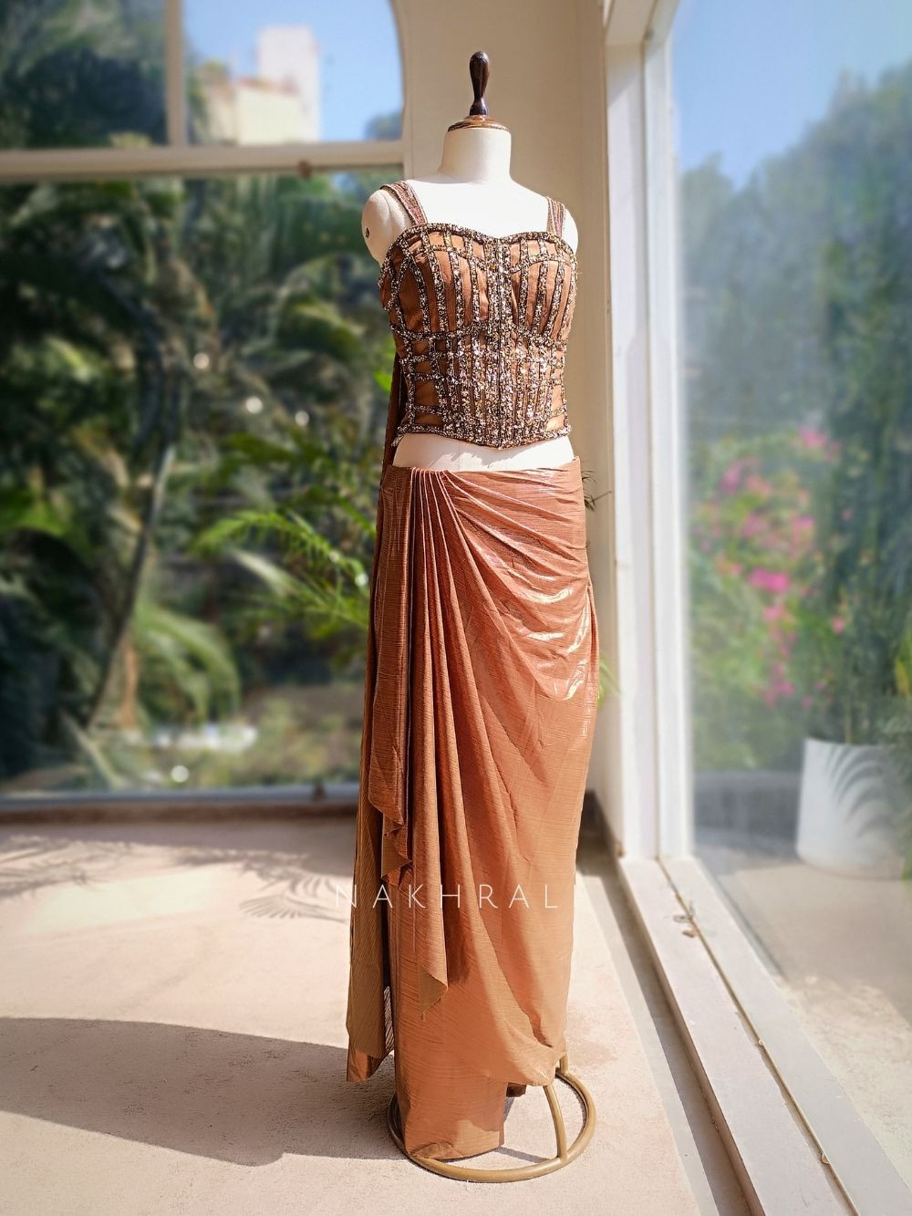 This brown indo-western set blends glamour with structured elegance. The corset features detailed grid-style sequin work with sheer paneling that enhances the sculpted silhouette, paired with a soft draped shimmer skirt that falls beautifully with every movement. Designed for modern celebrations, it delivers a bold yet refined statement look for cocktail nights, sangeet events, receptions, or high-end evening functions. Comfortable, stylish, and striking from every angle.