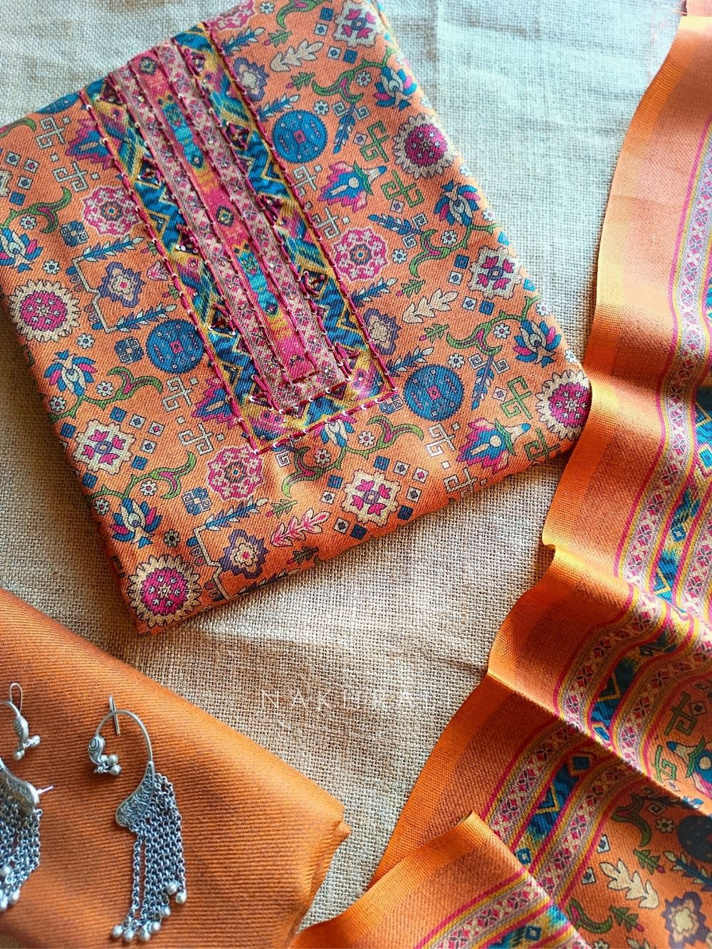 This woolen dress material blends traditional artistry with winter comfort. The beautifully detailed ethnic print adds depth and vibrance, while the soft woolen fabric keeps you warm without feeling heavy. Designed for graceful fall and effortless tailoring, it is ideal for winter outings, casual gatherings and festive occasions. A versatile choice for women who love style, comfort and heritage patterns in one timeless ensemble.
