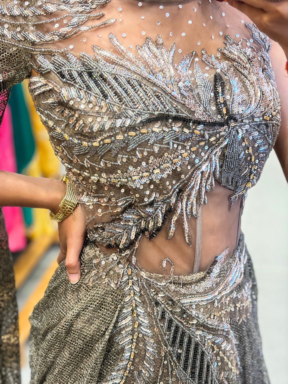 This couture-inspired drape gown is crafted in a structured yet fluid silhouette that contours the body while maintaining graceful movement. The design features an illusion bodice with sheer panel detailing, adding a modern edge to the overall look. The gown is intricately embellished with fine cut dana, sequins and beadwork arranged in bold, leaf-inspired patterns that create texture, depth and a striking visual impact. The embellishments are carefully placed to enhance the natural shape of the garment, giving it a sculpted appearance. A draped skirt with layered detailing adds dimension, while the attached cape element introduces fluidity and drama, balancing structure with softness. The rich brown tone further enhances the shimmer of the embellishments, making it ideal for evening occasions. Perfect for cocktail events, receptions and statement celebrations, this gown is designed for standout presence and elevated styling.