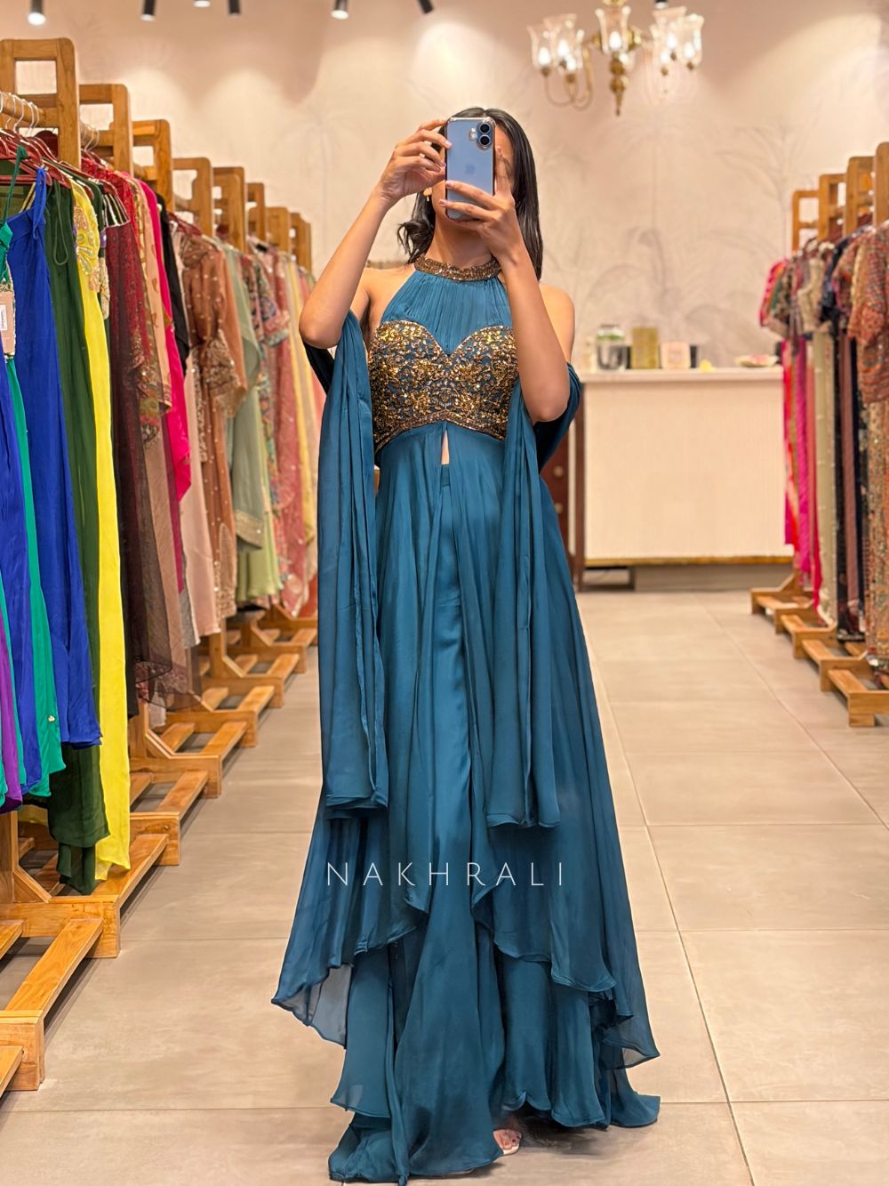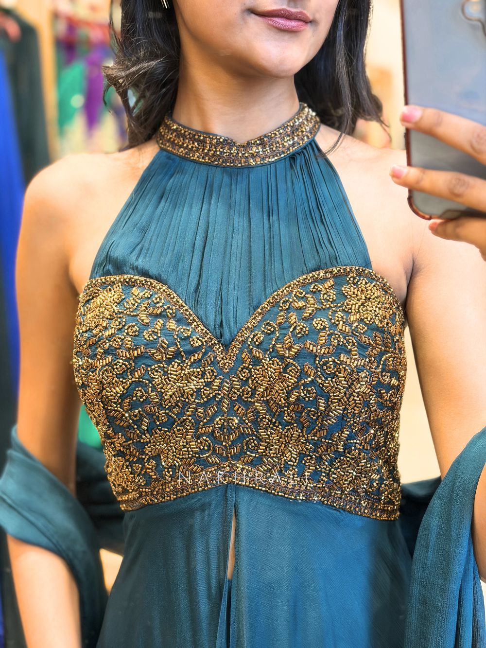 This indo western set is designed with a halter neckline and soft gathers that add structure and grace to the bodice. The top is heavily embellished with detailed cut dana work, creating a rich textured look. A front slit from the waist enhances movement while the layered flowy bottom adds volume and elegance. Perfect for evening functions, cocktail events, and festive celebrations where statement styling stands out effortlessly.