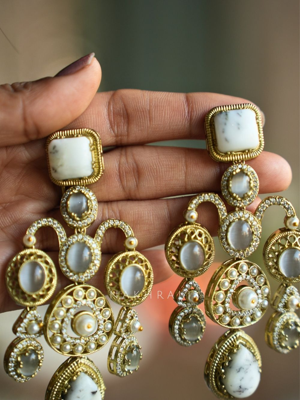 These statement earrings feature a beautifully structured silhouette with layered stone settings, delicate embellishments, and elegant drop accents that create movement and drama. Designed to stand out without feeling overpowering, the earrings balance traditional craftsmanship with a refined, contemporary finish. Lightweight yet impactful, they pair seamlessly with ethnic wear, fusion outfits, and festive ensembles, making them a versatile choice for celebrations, weddings, and special occasions.