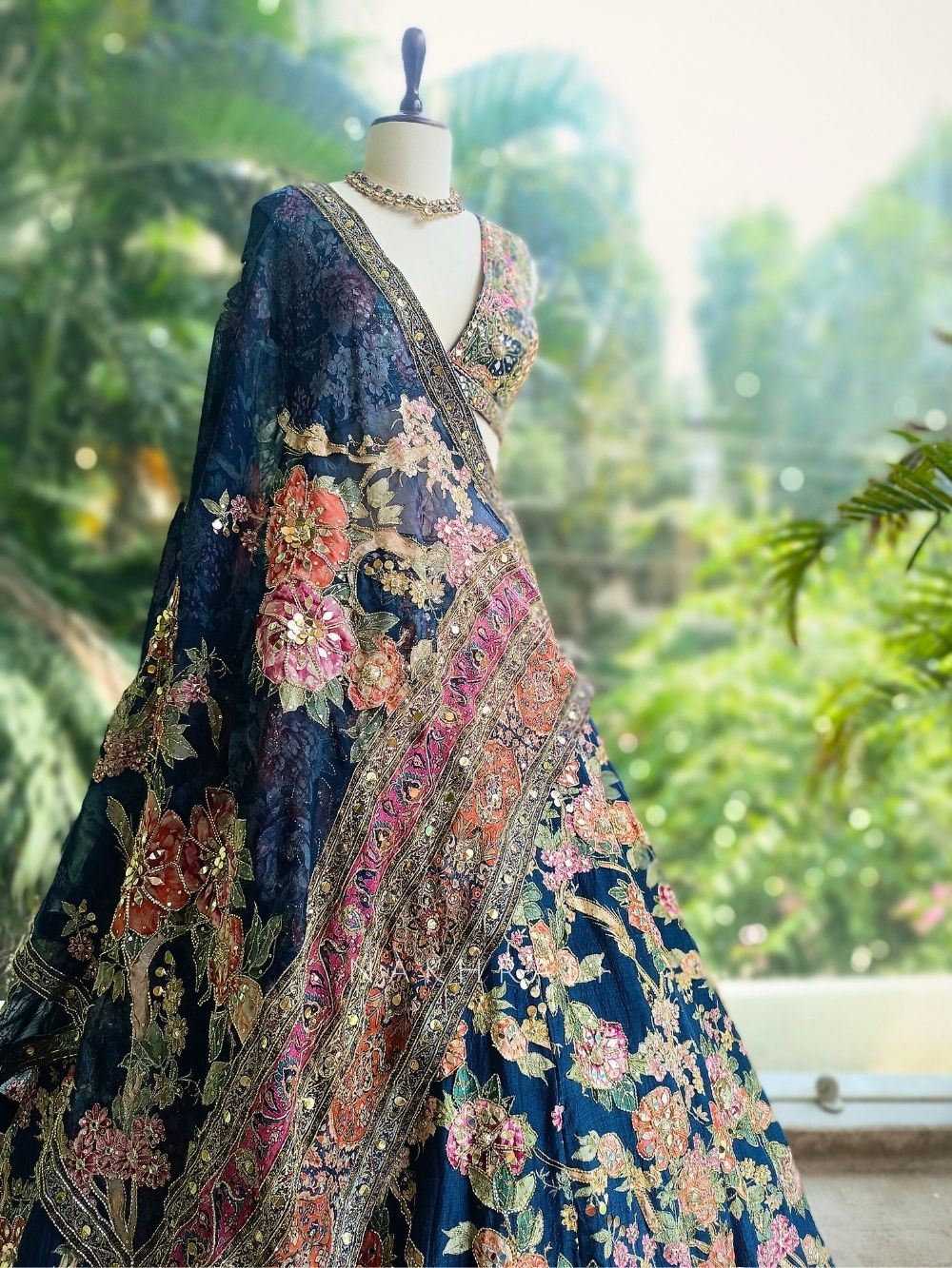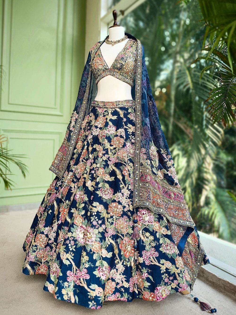 The Iravya Navy Floral Lehenga with Printed Dupatta is a breathtaking blend of tradition and artistry. Crafted on rich navy fabric, this lehenga blooms with vibrant floral motifs, highlighted by delicate zari and sparkling sequin work that add a regal shimmer to every movement. The blouse is adorned with equally detailed embroidery, perfectly complementing the lehenga. The dupatta, featuring a subtle floral print, adds a graceful finishing touch, creating a balanced ensemble that’s both festive and sophisticated. A timeless choice for weddings, sangeet nights, or receptions, this lehenga ensures you stand out with elegance and charm.