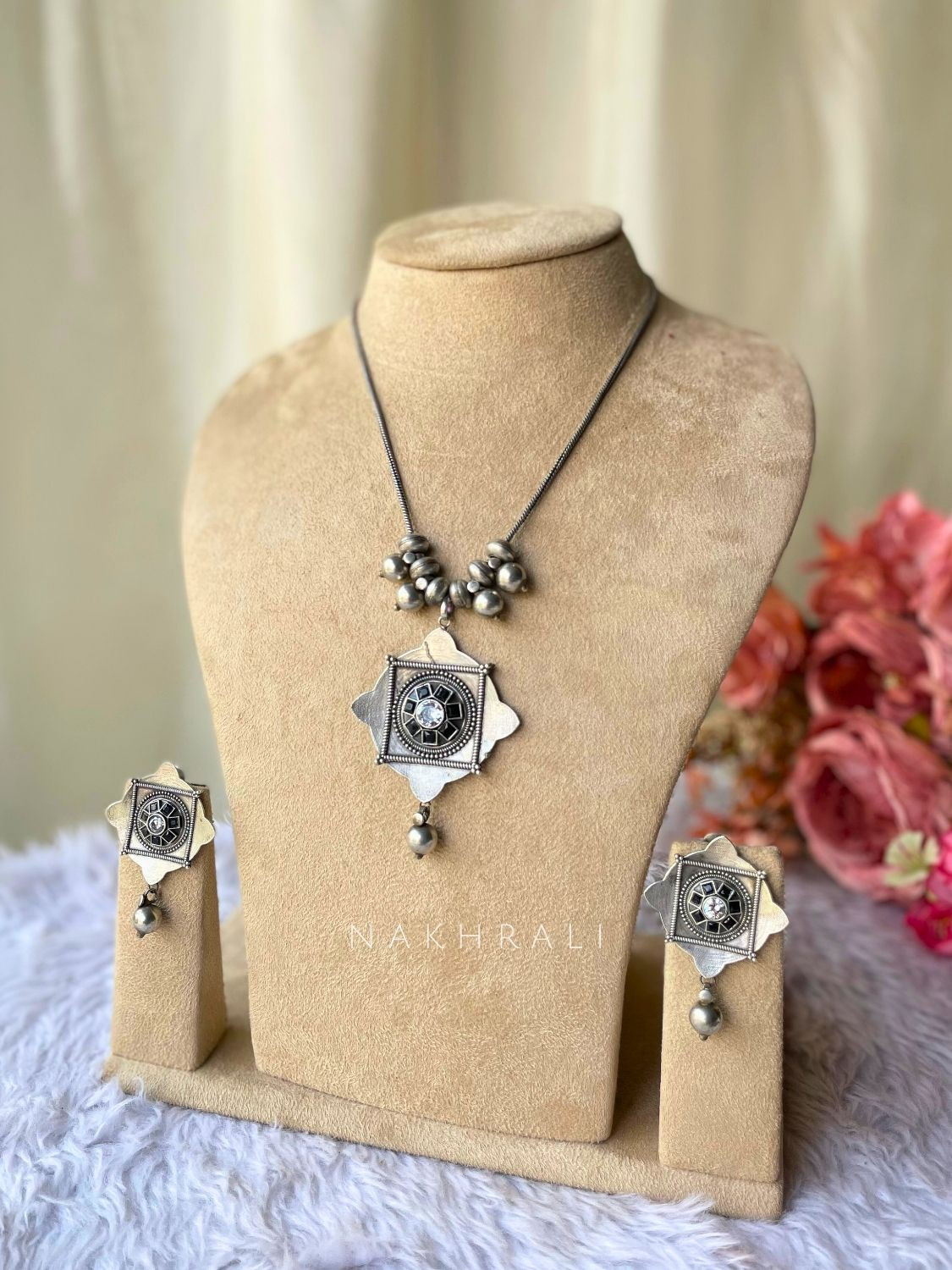 This oxidised silver pendant set stands out with its structured geometric design inspired by traditional metal artistry. The central stone detail adds subtle contrast, while the handcrafted finish gives it a raw, timeless character. Paired with matching earrings and delicate bead drops, this set strikes the perfect balance between statement and wearability, making it ideal for daily ethnic looks as well as understated festive outfits.