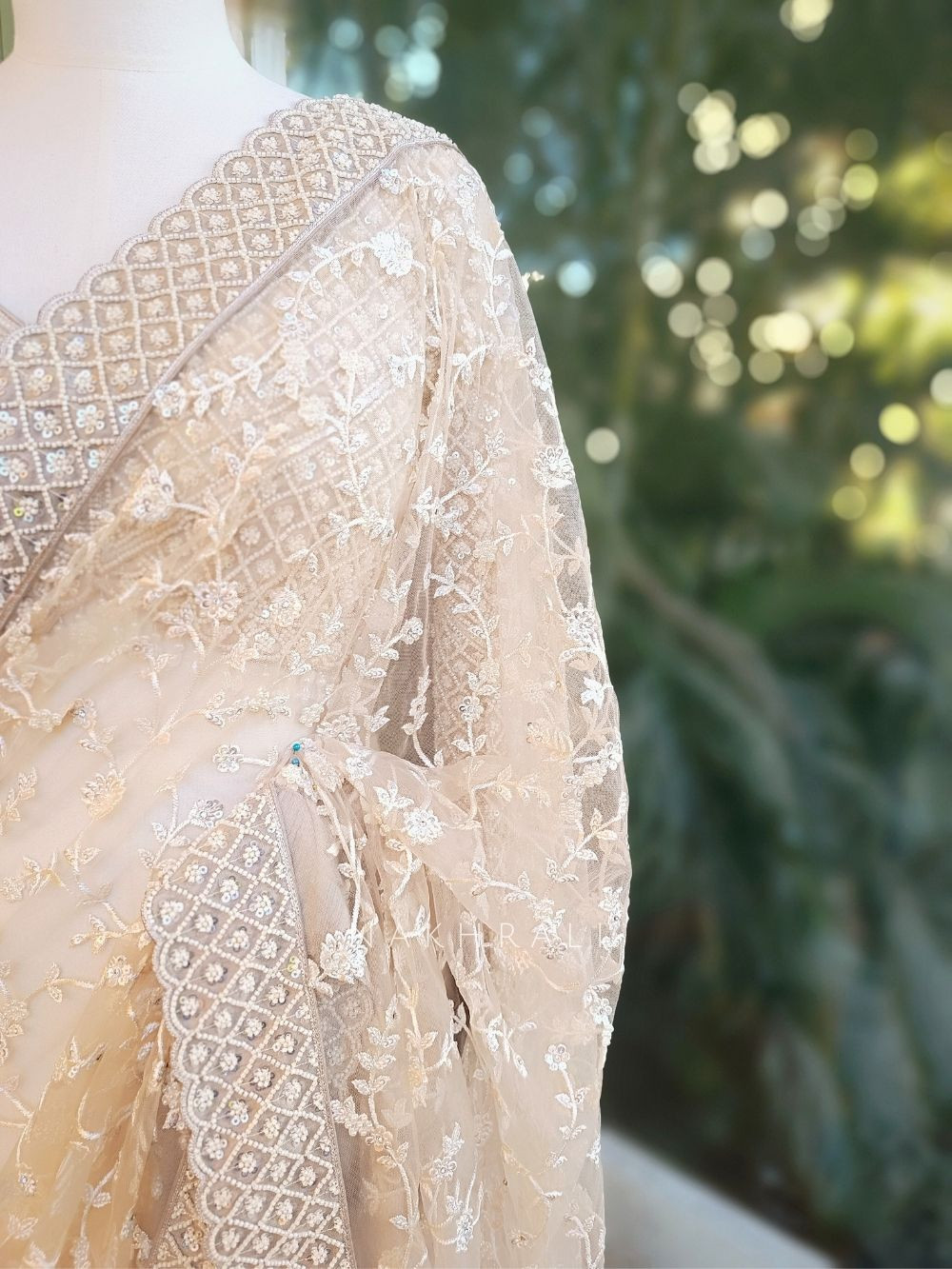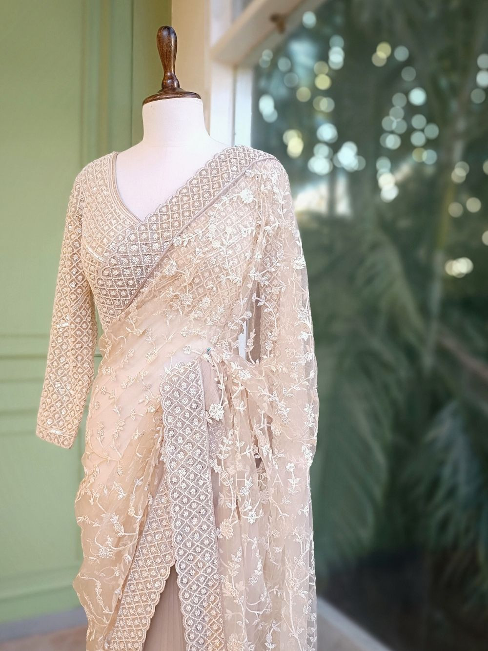 Ivory Sand Embroidered Net Saree with Readymade Blouse