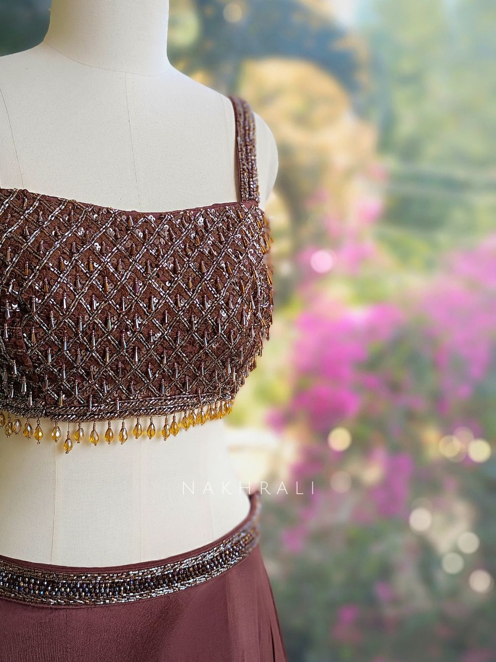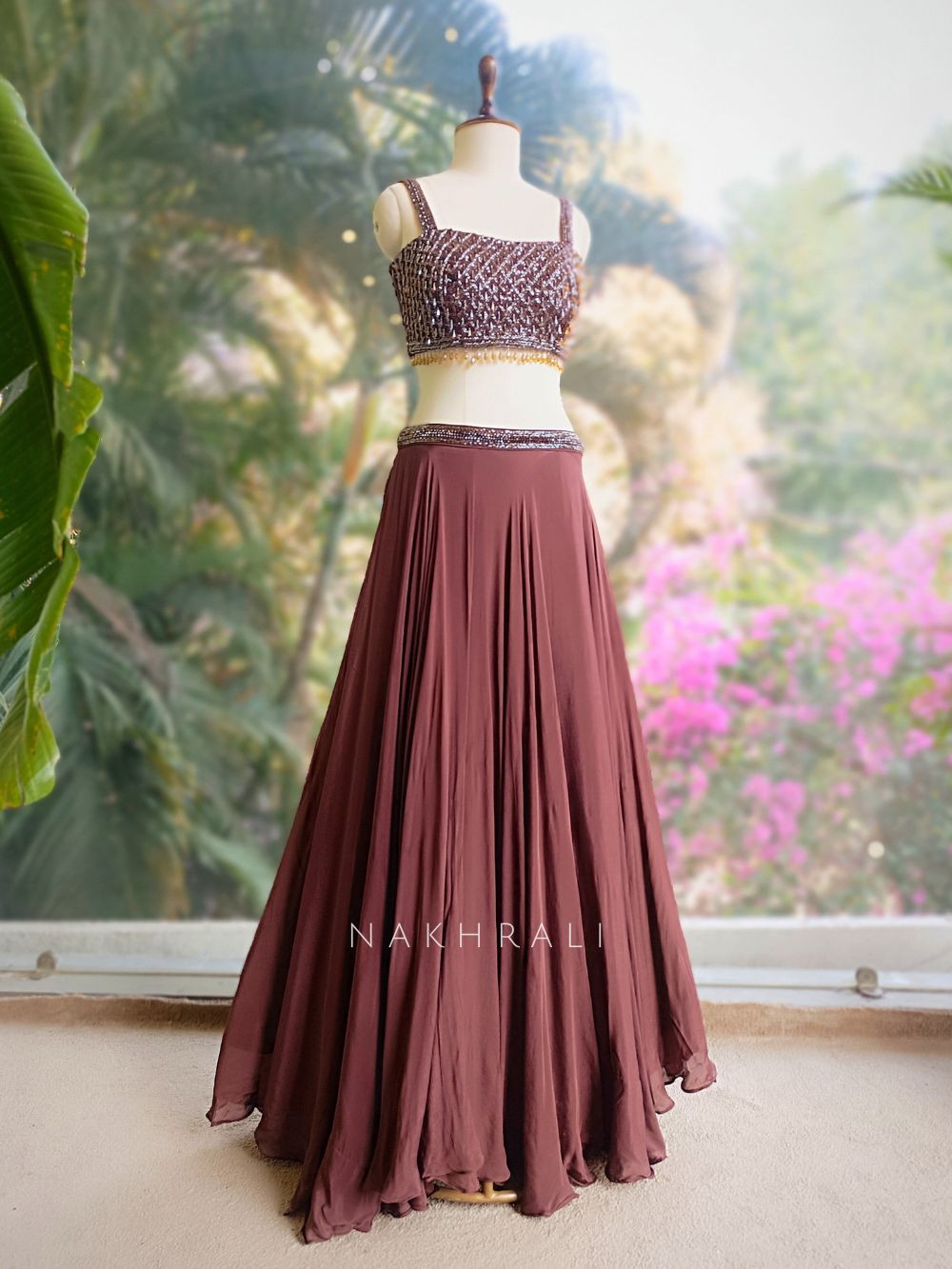 This brown indo-western lehenga set is designed for modern festive dressing with a bold yet elegant edge. The structured blouse is highlighted with intricate cut dana and sequin work along the neckline, adding refined shimmer without overpowering the look. The lehenga skirt flows gracefully with soft volume, creating movement and drama, while the lightweight dupatta completes the ensemble with a contemporary drape. Ideal for cocktail nights, festive soirées, and evening celebrations where you want effortless glamour with a modern silhouette.