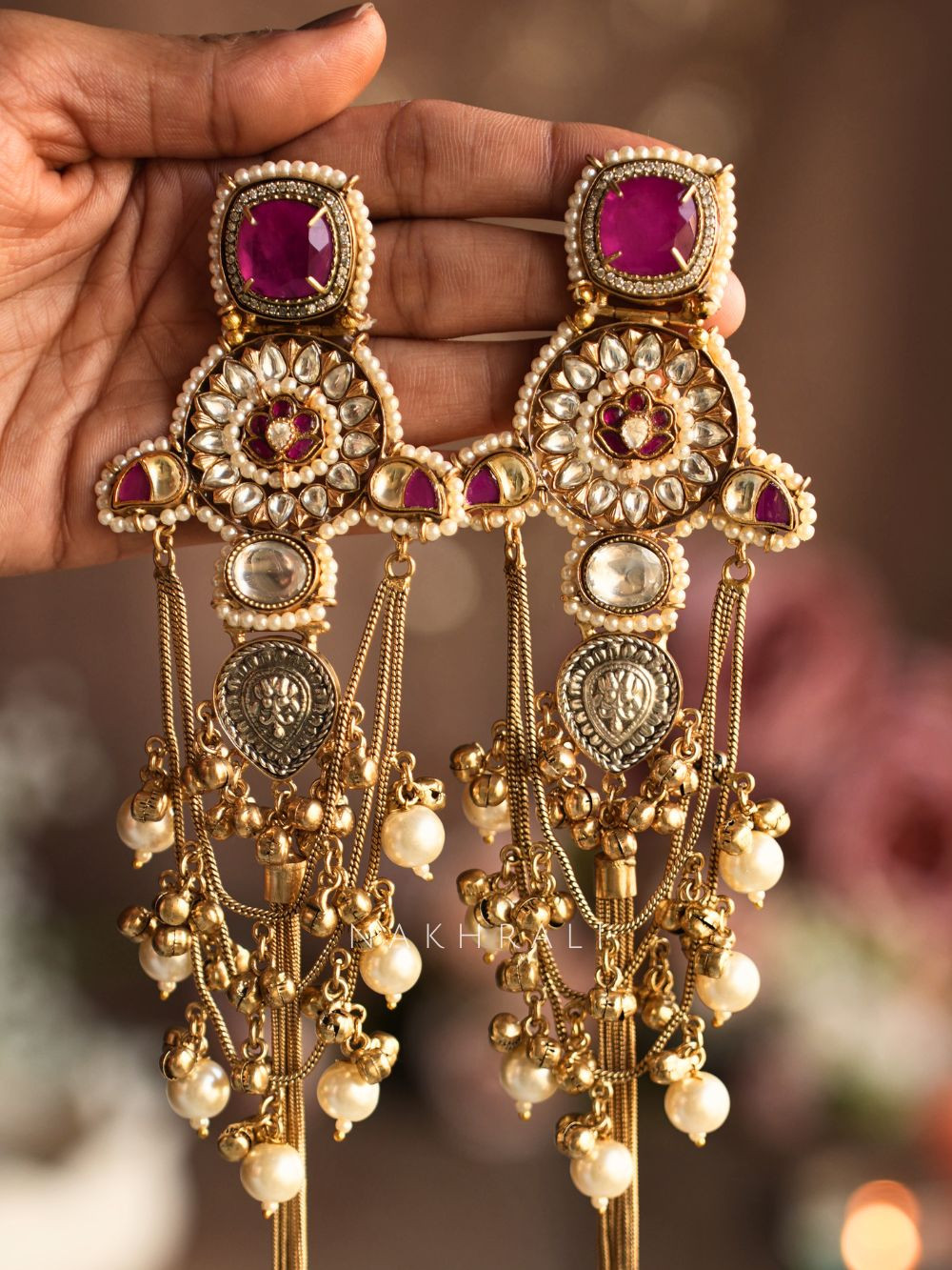 These Kashmiri-inspired long earrings are designed to make an instant impact. Featuring ornate kundan-style motifs with intricate enamel detailing, they are finished with multiple cascading chains, pearl drops, and antique-gold accents that move beautifully with every step. The elongated silhouette adds elegance and drama, making these earrings a perfect choice for weddings, festive celebrations, and statement ethnic styling. Available in three striking color variants — yellow, magenta, and peach — each version offers a distinct yet timeless appeal while maintaining the same rich craftsmanship and grandeur.