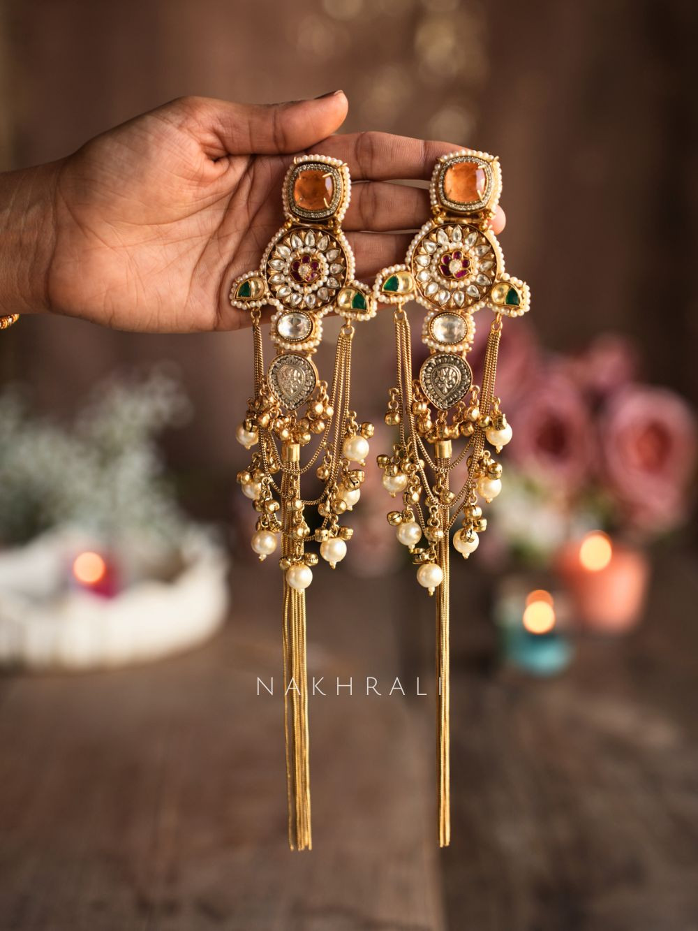 These Kashmiri-inspired long earrings are designed to make an instant impact. Featuring ornate kundan-style motifs with intricate enamel detailing, they are finished with multiple cascading chains, pearl drops, and antique-gold accents that move beautifully with every step. The elongated silhouette adds elegance and drama, making these earrings a perfect choice for weddings, festive celebrations, and statement ethnic styling. Available in three striking color variants — yellow, magenta, and peach — each version offers a distinct yet timeless appeal while maintaining the same rich craftsmanship and grandeur.