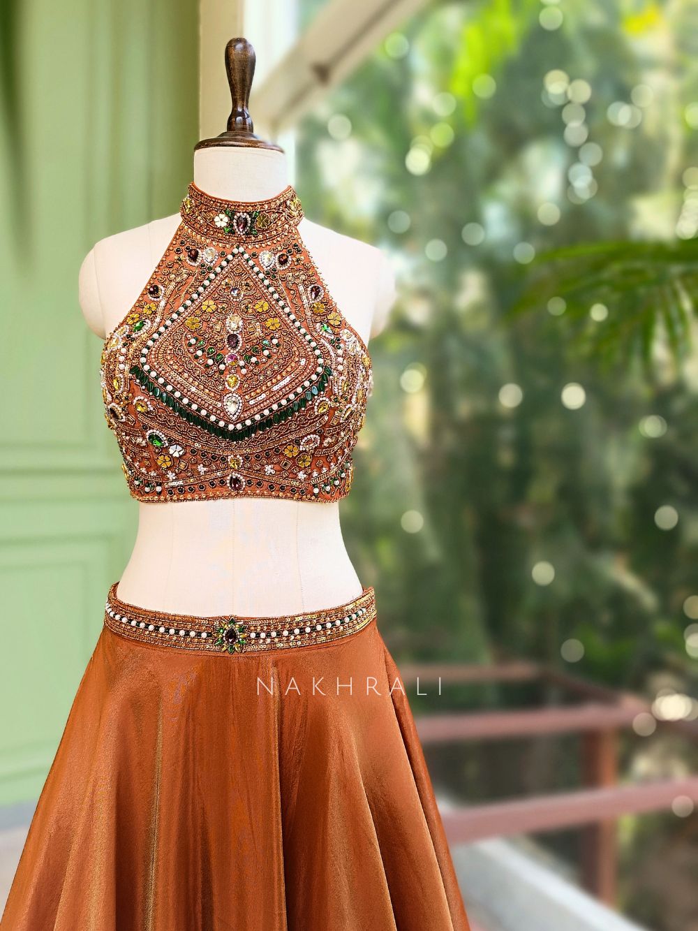 This Rust lehenga set showcases a richly embroidered halter-neck blouse adorned with intricate zari, bead, and stone embellishments arranged in detailed geometric and floral patterns. The blouse features a structured neckline, fitted silhouette, and a back zip closure for a clean finish. It is paired with a soft, flared lehenga skirt designed for graceful movement and an elegant fall. The coordinated dupatta completes the look, making this set a perfect choice for cocktail nights, sangeet functions, and modern wedding celebrations.