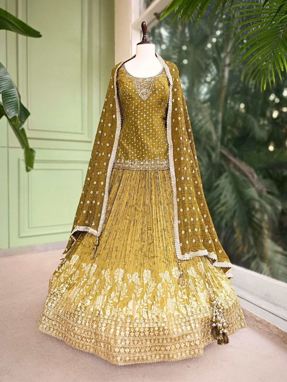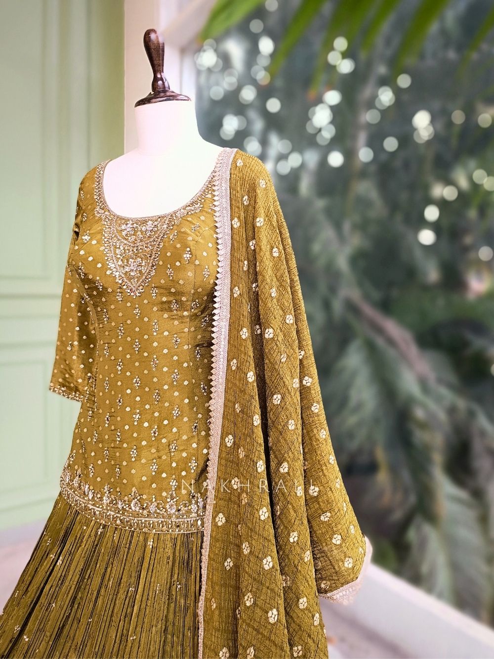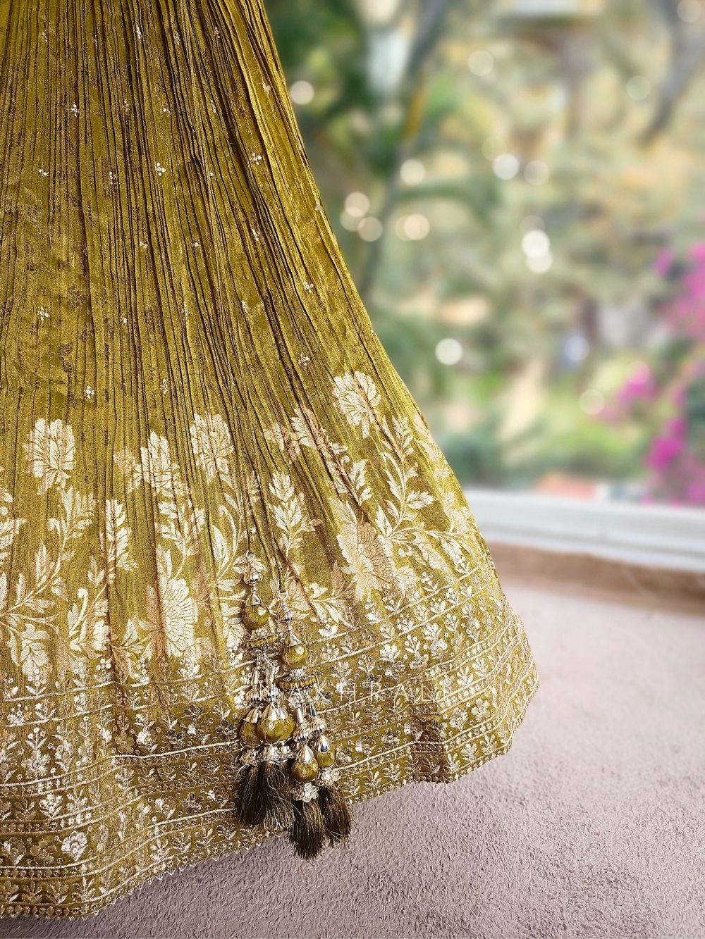 This mehendi green kurta lehenga set is crafted for those who appreciate subtle richness over loud shine. The kurta-style blouse features fine hand embroidery with scattered butis and a detailed neckline, giving it a graceful, elongated silhouette. Paired with a softly pleated lehenga skirt, the look feels fluid yet structured, finished with a richly woven border and hanging tassel details. The matching dupatta adds depth with its textured weave and embroidered accents, completing a look that is elegant, versatile, and timeless—perfect for intimate celebrations and festive occasions.